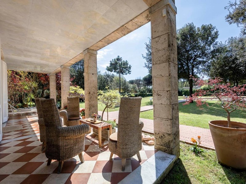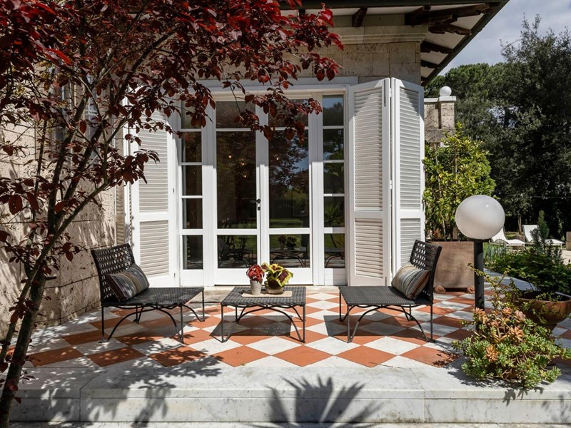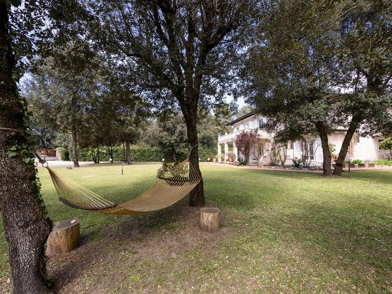 Gli spazi esterni sono curati con la stessa attenzione degli interni. L’equilibrio tra prati assolati e zone ombreggiate crea un’oasi di pace, ideale per il relax o per ricevimenti eleganti.
