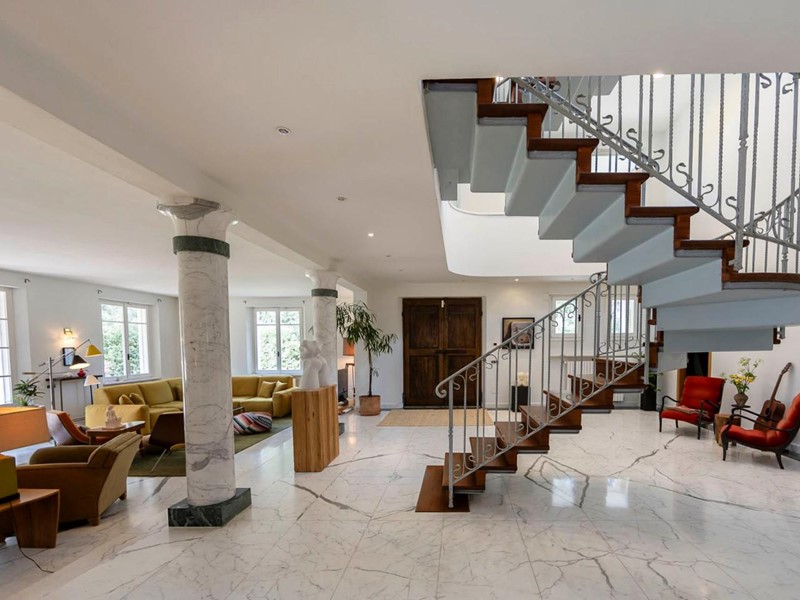 Ampio ingresso, dominato da una scenografica scala, dà subito il tono: elegante e accogliente.