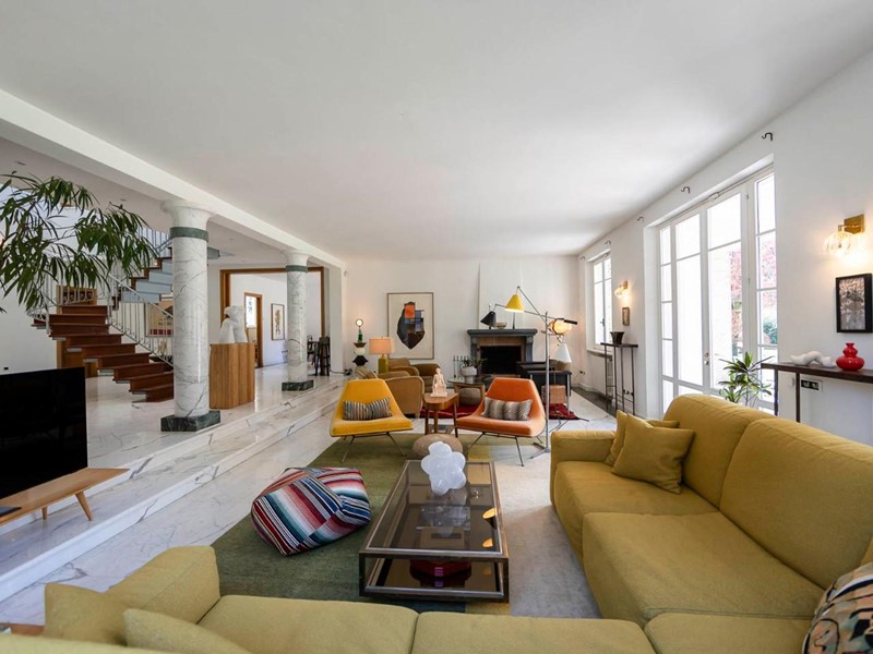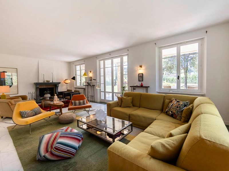 Soggiorno open space, con camino, doppie porte-finestre e numerose vetrate, è perfetto per momenti conviviali.
