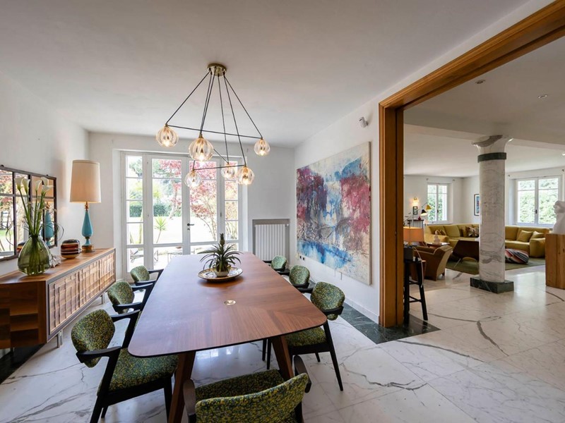 Sala da pranzo formale, anch’essa con camino e porte-finestre affacciate sul giardino, invita a lunghe cene con amici e familiari.