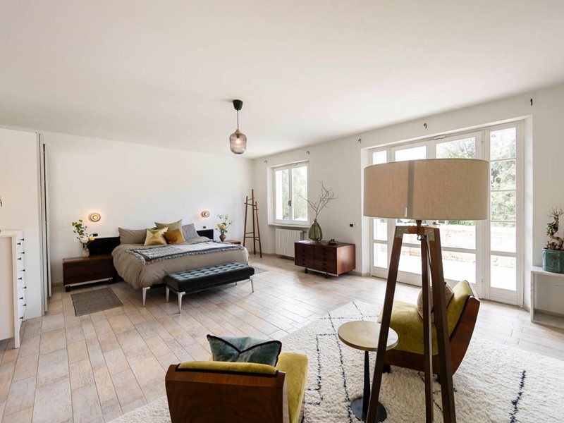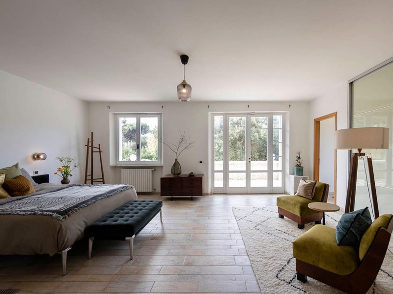 Suite padronale, un rifugio esclusivo con bagno privato, cabina armadio doppia, zona vanity e doppie porte-finestre che si aprono su una terrazza esposta a ovest, con vista sull’intera proprietà.