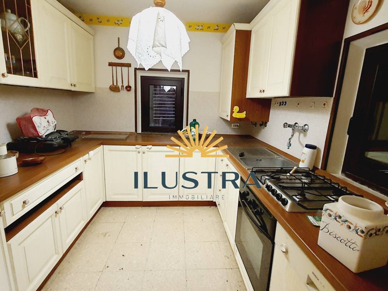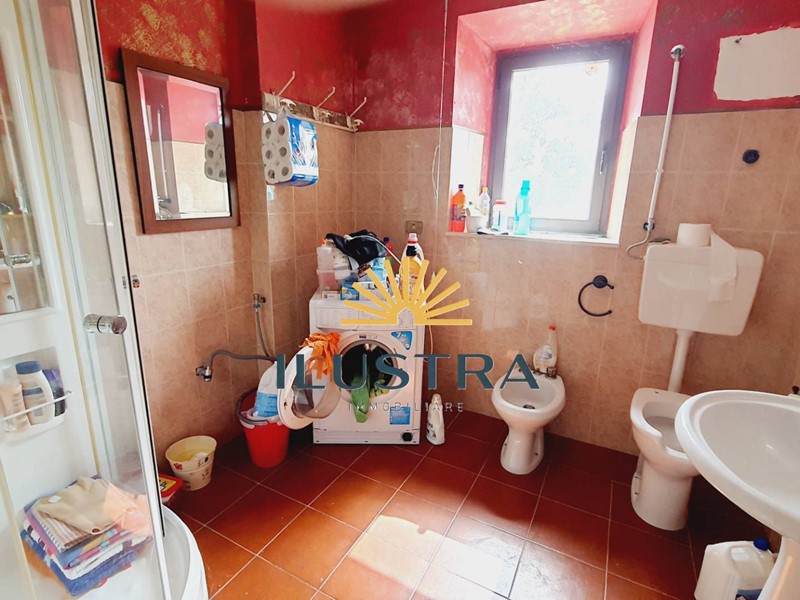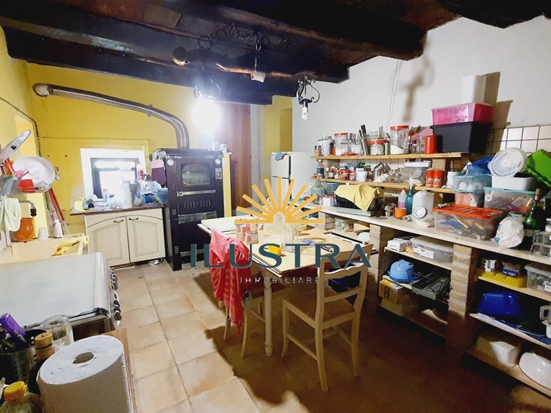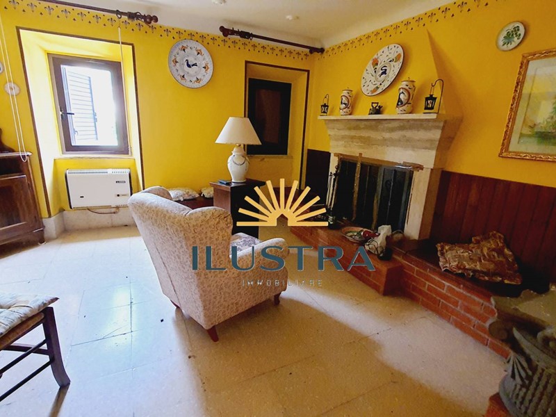 - Piano terra con ampio soggiorno stile rustico con rivestimento in pietra, travi in legno a vista e caminetto, cucina abitabile attrezzata con forno a legna, due camere doppie, bagno finestrato con doccia.