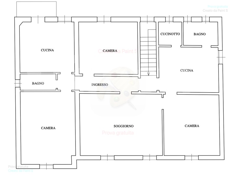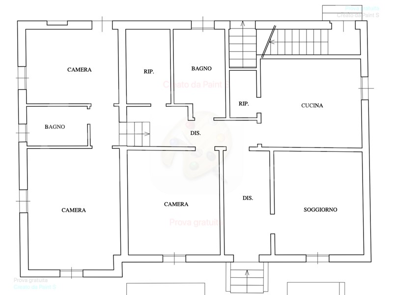 Piano Primo: appartamento composto da: ingresso, soggiorno, sala da pranzo, cucinotto, 4 camere da letto matrimoniali, 2 bagni e balcone.