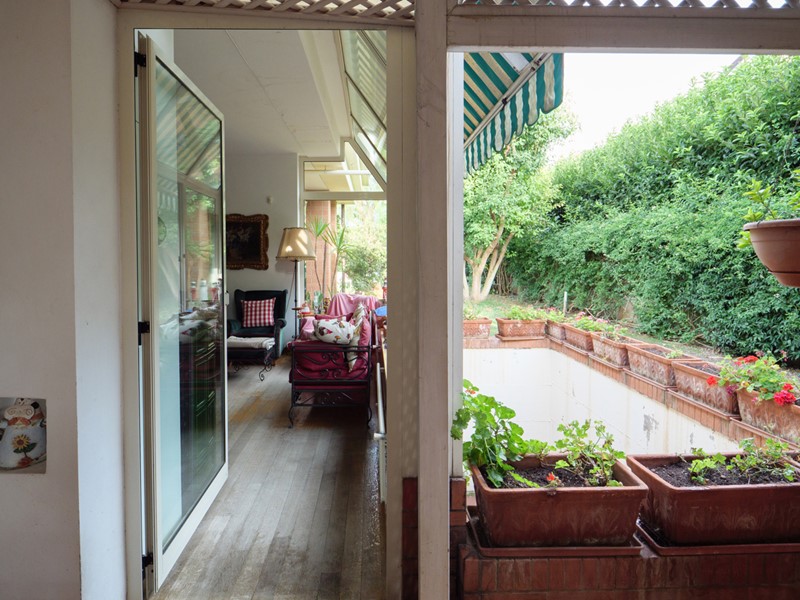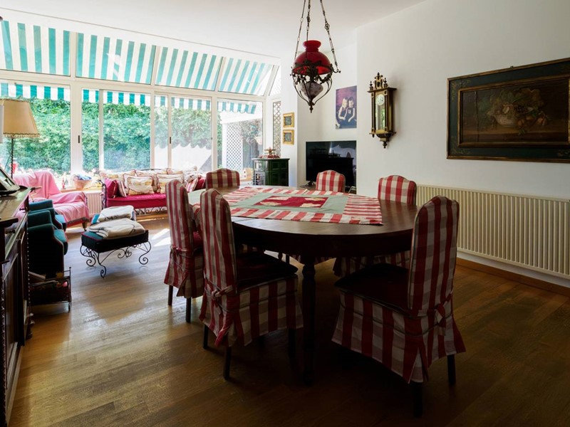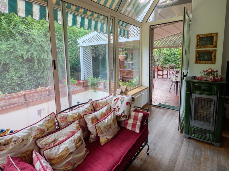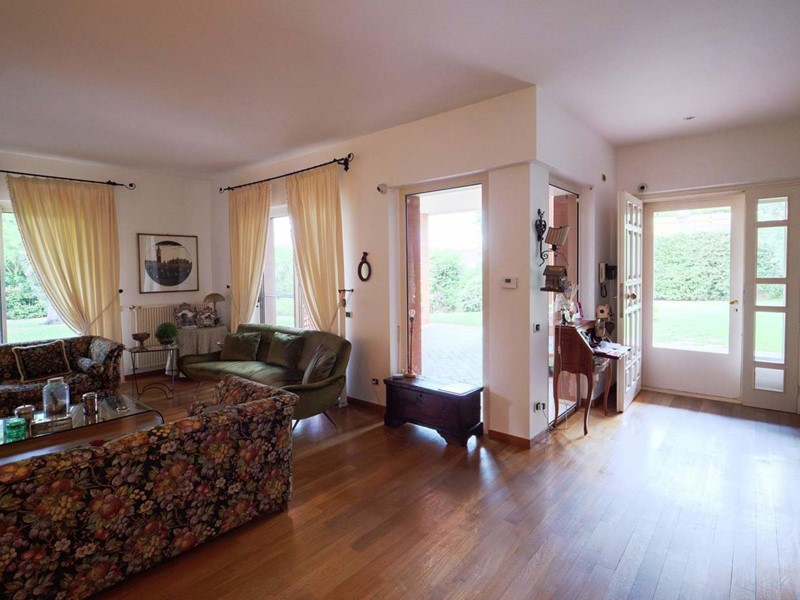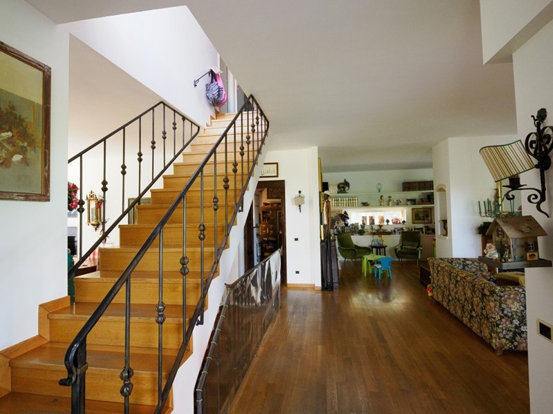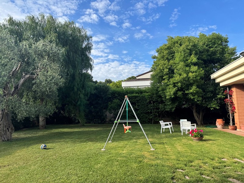 Entrando ci accoglie il salone angolare, con un elegante camino centrale intorno al quale si distribuiscono gli spazi di rappresentanza con porte e affacci sul verde rigoglioso del giardino. La bella zona pranzo, anch'essa affacciata sul verde, è annessa all'accogliente cucina. Dalla cucina e dalla zona pranzo accediamo alla zona del giardino attrezzata con una ulteriore zona pranzo esterna, e con una zona relax. Al medesimo piano, ben disimpegnati, una camera con accesso indipendente dal giardino ed il bagno. Il primo piano accoglie la zona notte con 3 camere da letto: la camera padronale con la cabina armadio, il bagno proprio ed il terrazzino; le altre 2 camere anch'esse con bagno. Nel piano seminterrato si trova un grande ambiente vivibile, con accesso indipendente dal giardino, luminoso grazie alle grandi finestre ed un bagno, oltre la grande lavanderia ed i vani tecnici. Il giardino, con il prato all'inglese ed il susseguirsi di siepi, cespugli, piante da fiore, alberi ed arbusti, riveste un ruolo da protagonista. villa