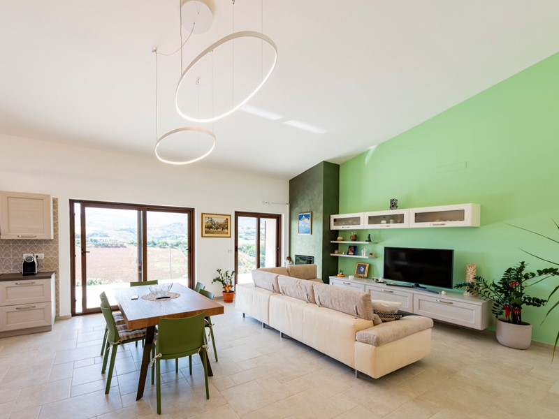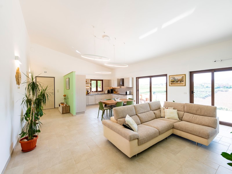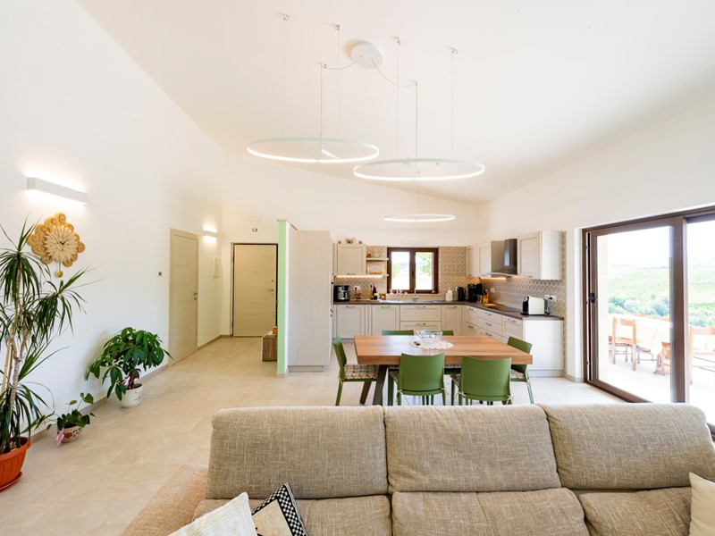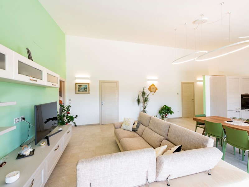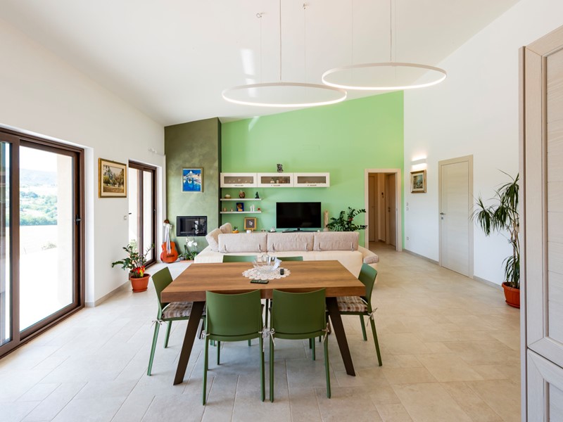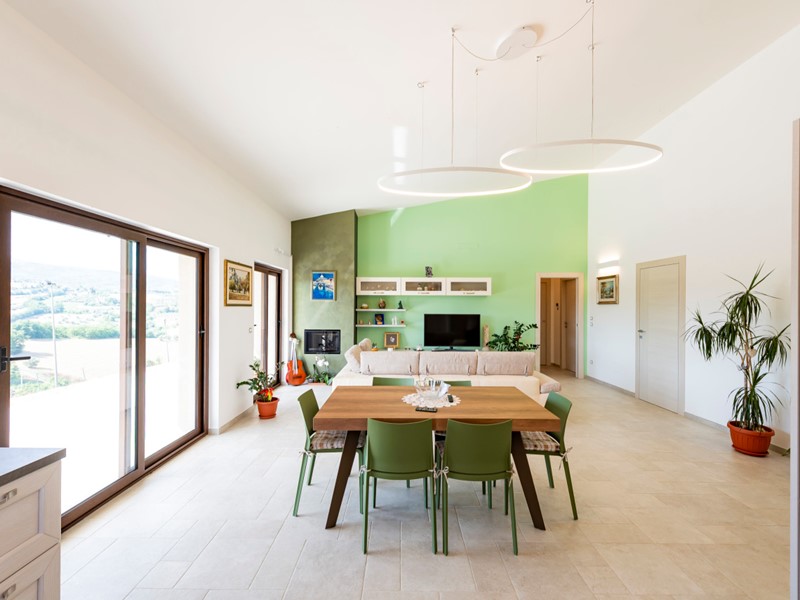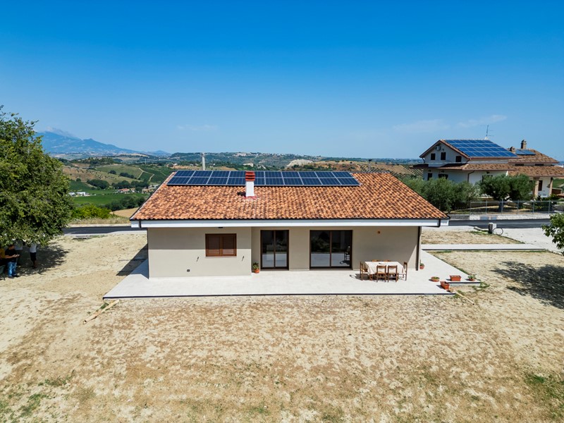 Proponiamo in Vendita splendida Villa singola con giardino e terreno, dislocata su unico livello per complessivi mq catastali 144 e così distribuita: ingresso, ampio soggiorno con cucina a vista e caminetto, disimpegno, camera matrimoniale, camera doppia, doppi servizi, locale tecnico e dispensa. Esternamente la villa è dotata di garage (rimessa attrezzi) di mq 60 circa mentre il terreno incluso nella vendita è di circa 3.300 mq. Trattasi di nuova costruzione, costruita e pensata per abbattere al meglio i costi di riscaldamento e ridurre al mimino le dispersioni termiche, infatti la Villa è dotata di impianto di Solare con pannelli fotovoltaici (10 KW) e batteria di accumulo, infissi in triplo vetro, impianto di riscaldamento a pavimento con pompa di calore, predisposizione climatizzatori, cappotto termico perimetrale su tutta la struttura (10 cm) oltre ad uno strato doppio di cappotto sul tetto (20cm). Posizione rialzata, tranquilla e particolarmente panoramica con stupenda vista a 360°.