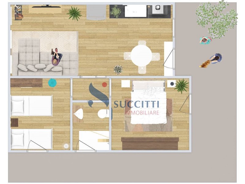 All'interno, gli spazi sono ben distribuiti: un ampio soggiorno con angolo cottura, due spaziose camere matrimoniali, un disimpegno, un pratico ripostiglio e un bagno finestrato con box doccia.