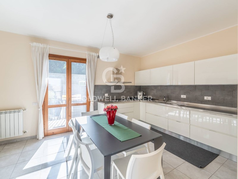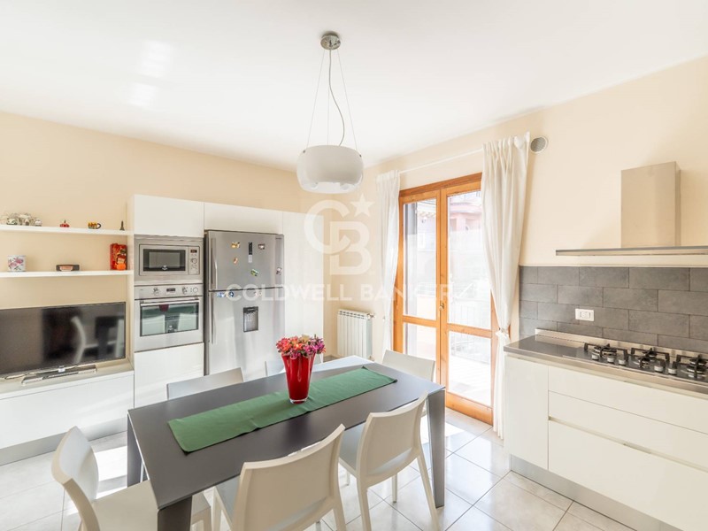 Lingresso si apre su un ampio salone, accogliente e ben illuminato, dotato di camino, a seguire troviamo l'ampia cucina, indipendente e funzionale, collegata al salone attraverso elegante porta scorrevole, rifinita con pavimentazione in gres.