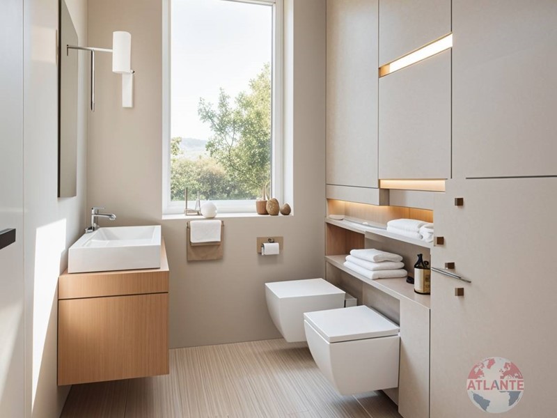 two modern bathrooms with suspended sanitary fixtures and shower