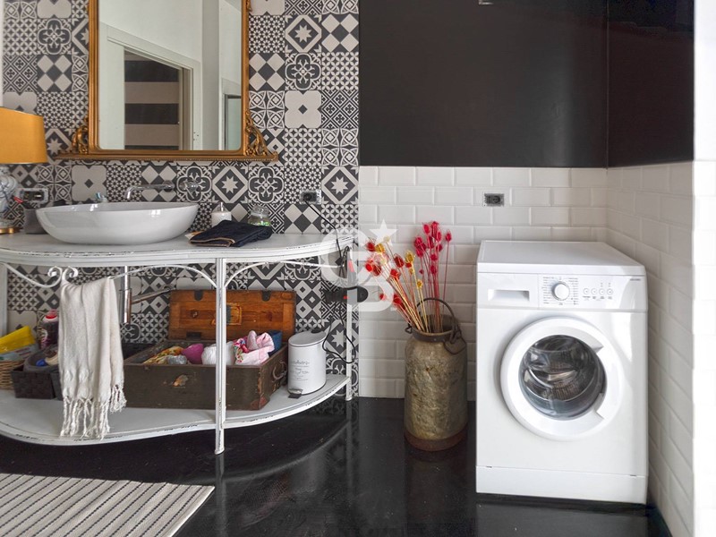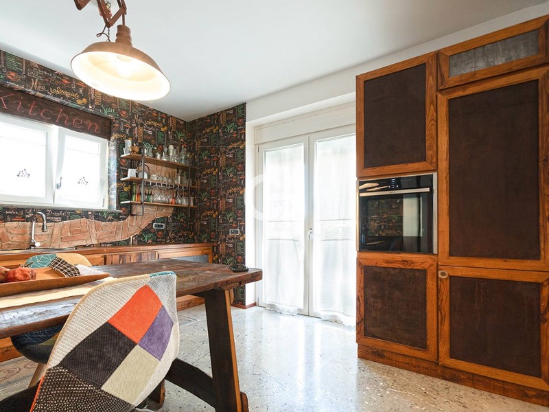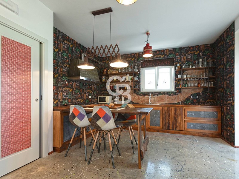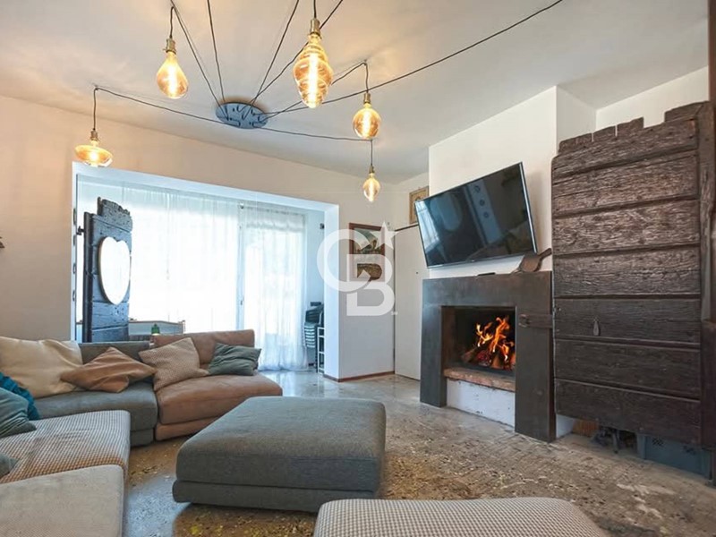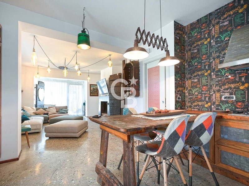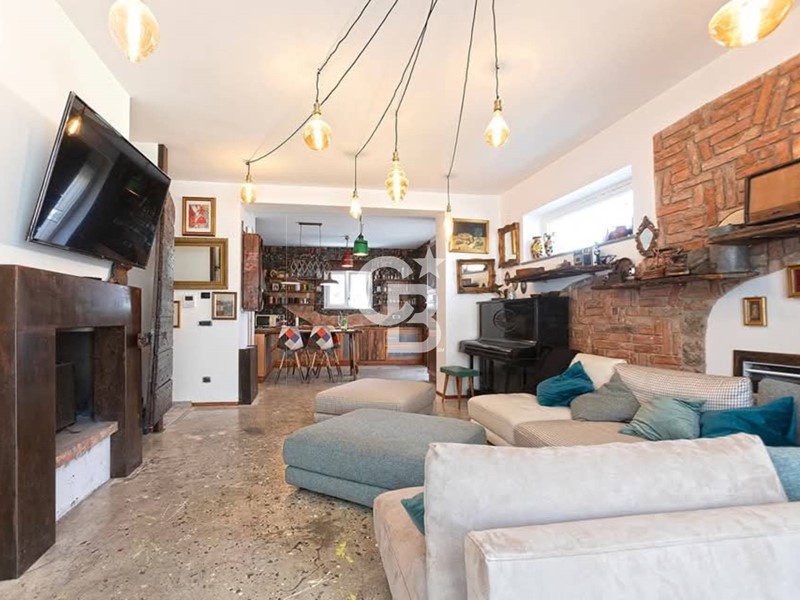 Lingresso conduce a unampia zona giorno luminosa, con camino e grandi aperture sul giardino, ideale per chi desidera vivere in continuità con gli spazi esterni. La cucina, realizzata su misura, è dotata di una comoda dispensa separata e si integra perfettamente con lo stile moderno-industriale della casa.