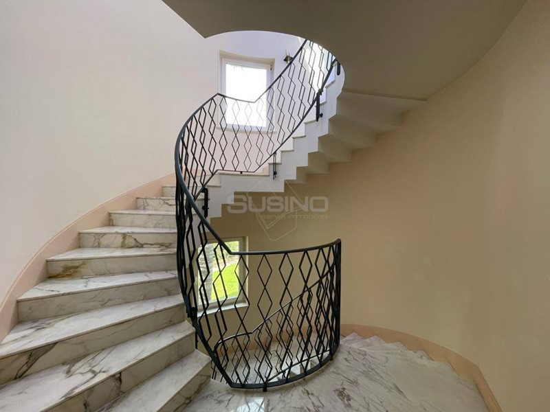 al piano cantinato, fornito di servizi, si trova un box auto e ampi spazi ludico/ricreativi; il piano rialzato vede il comodo ingresso principale che diventa spazio servente per: zona di rappresentanza (ampio salone), zona servizi (cucina/pranzo e bagni) e l'imponente scala elicoidale che collega i livelli; il piano superiore conta tre camere da letto, accessoriate da zone spogliatoi e servizi.