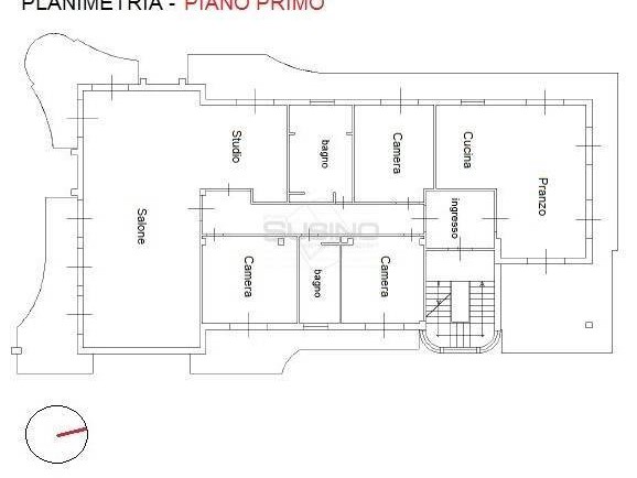 L'appartamento, che occupa l'intero primo piano di una piccola palazzina, presenta la seguente distribuzione interna: ingresso disimpegnato, salone triplo oltre angolo studio, comoda ed articolata cucina-pranzo con camino, 3 camere da letto e 2 bagni. Ogni ambiente gode di affacci da balconi/terrazzi a livello che, aprendosi su tutti e quattro i lati, favoriscono ottima illuminazione ed aerazione degli interni.