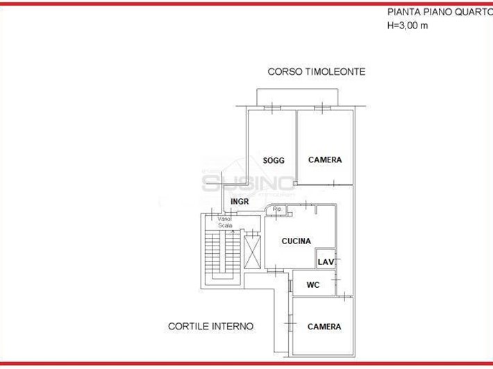 Ingresso aperto sul salone, due camere, soggiorno con cucina a vista attrezzata di vano dispensa, bagno, doppio servizio e ripostiglio.