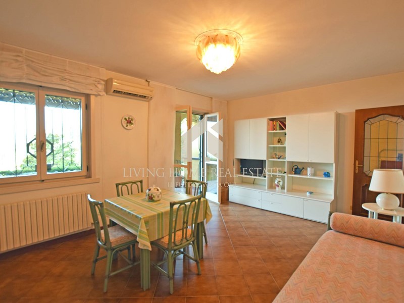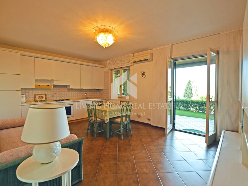 soggiorno luminoso con cucina a vista arredata, affacciato su terrazzo loggiato e giardino,