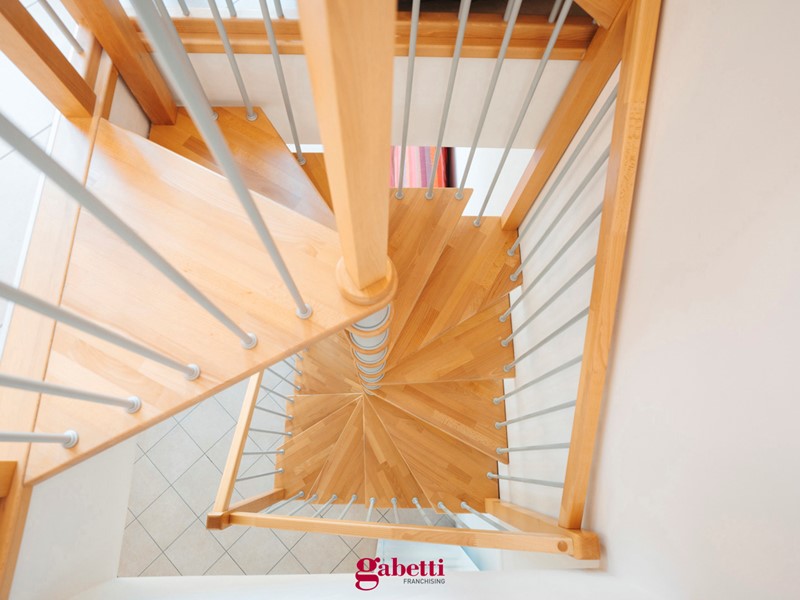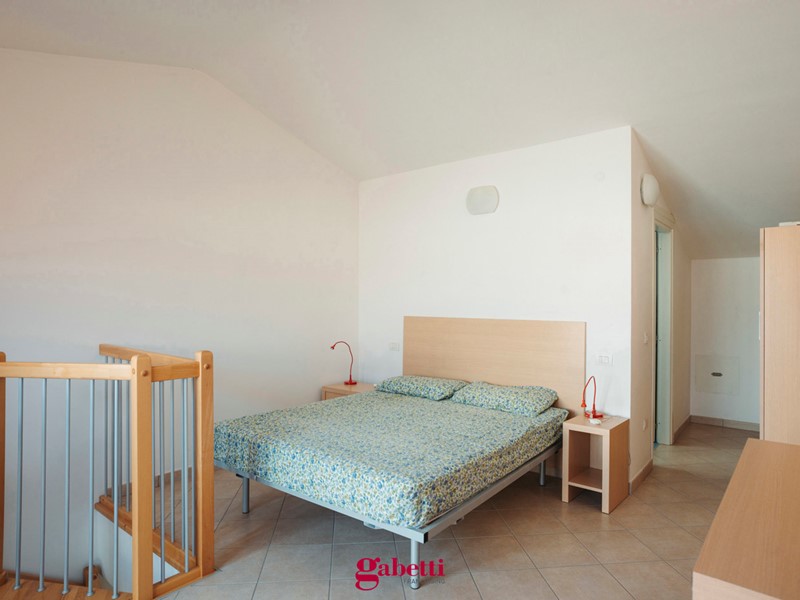 Una scala a chiocciola in legno conduce al piano superiore, in cui troviamo un'ampia camera da letto matrimoniale con bagno e terrazzino.