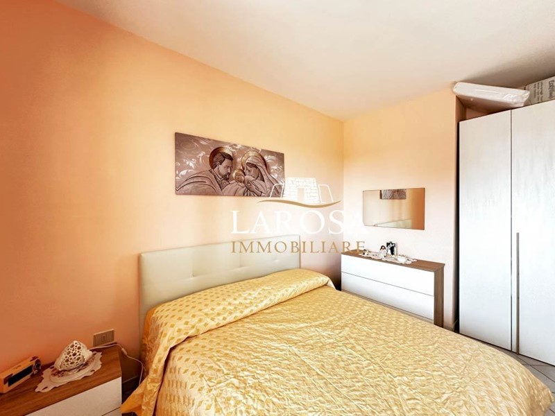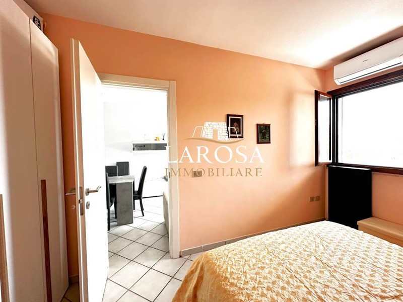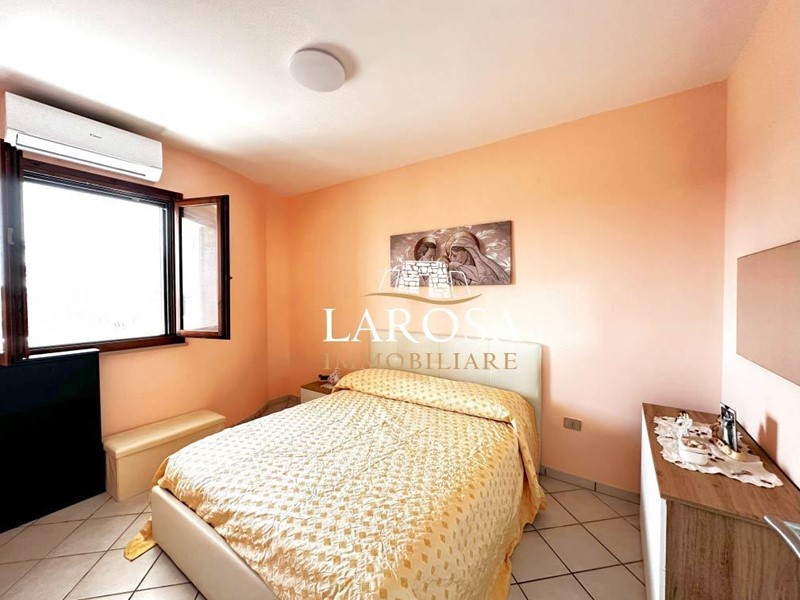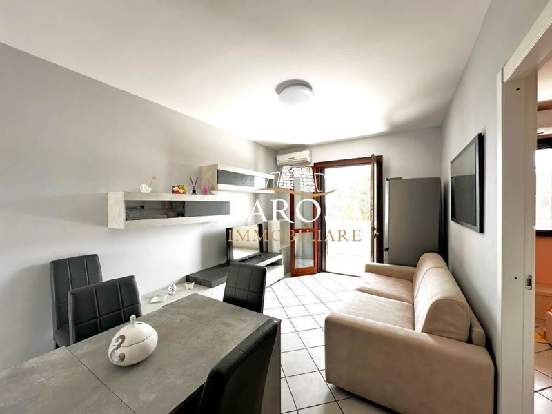 L’appartamento è situato al primo piano di un complesso residenziale, di fronte all’edificio si trovano un’ampia area parcheggio, zone verdi attrezzate, e una rampa di scale comune che conduce agli appartamenti del primo piano dalla rampa si accede al pianerottolo e al portoncino d’ingresso, che si apre su un ampio soggiorno/cucina open space con angolo cottura attrezzato. Una porta finestra collega il soggiorno all’ampio balcone verandato, offrendo una vista panoramica sul villaggio. La zona notte comprende un piccolo disimpegno, una camera da letto singola, una matrimoniale, entrambe con finestra, e un bagno con lavabo, servizi igienici, doccia e finestra.