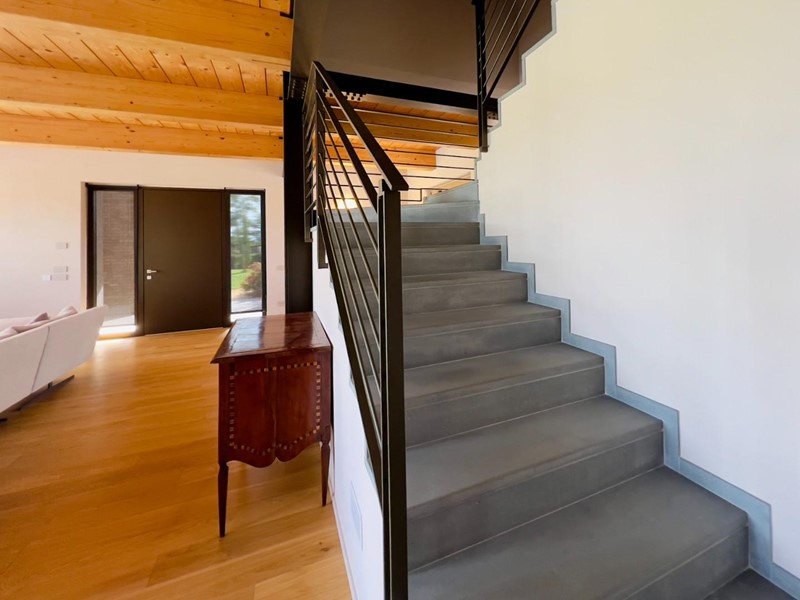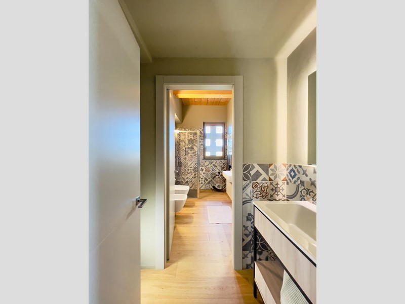 Una imponente scala in pietra serena conduce al piano primo, ove si trovano due camere da letto matrimoniali, di cui una con guardaroba ed una con accesso ad un grande loggiato, una sala da bagno con vasca e doccia. Infine, una master room con servizio igienico privato, grande terrazza panoramica e giardino pensile.