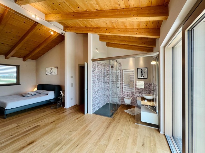 La villa, che si dispone su due piani fuori terra, è composta, al piano terra da ingresso attraverso un grande loggiato, in una immensa zona living con camino bifacciale che si collega alla grande cucina con sala da pranzo che ha l’uscita verso il loggiato con vista parco. Un bagno per ospiti dotato di box doccia, una zona palestra o zona ludica con accessori e un locale tecnico, completano il piano terra.