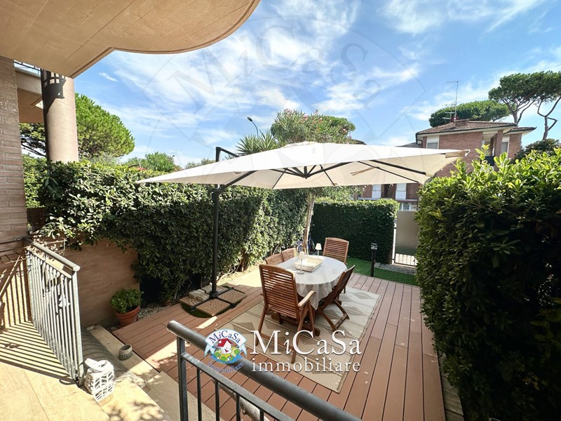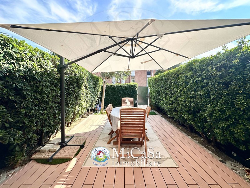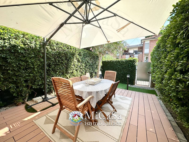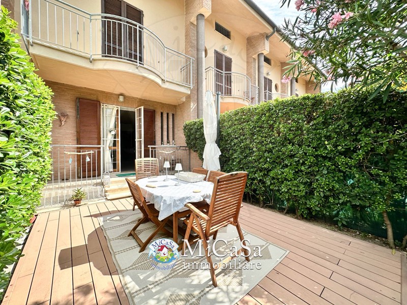 In piccolo complesso residenziale a pochi passi dalla piazza centrale, proponiamo appartamento al piano terra rialzato con ingresso indipendente e giardino esclusivo fronte-retro, perfetto sia come abitazione principale che come comodo appoggio al mare.