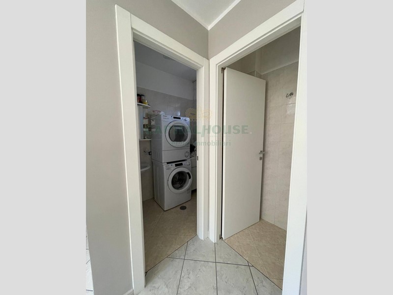 Anche da qui puoi uscire su un balcone, mentre un bagno moderno con doccia e una pratica zona lavanderia completano il piano.