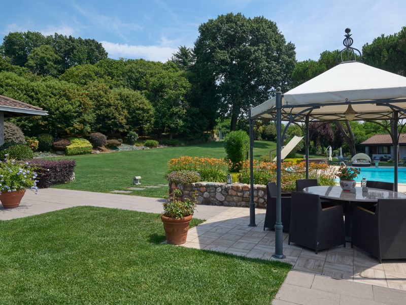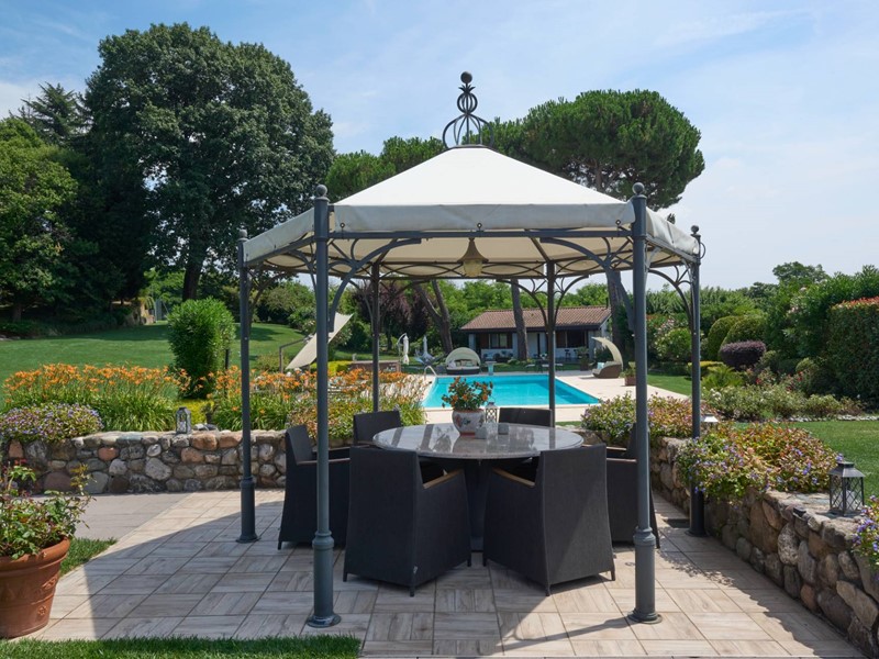 Suggestiva veranda coperta nel cuore del giardino, attrezzata con barbecue in muratura e forno a legna tradizionale, perfetta per cene conviviali e serate allinsegna del gusto
