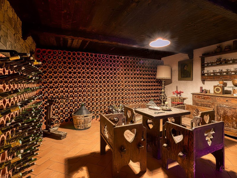 Completa la soluzione una cantina climatizzata in stile rustico, con scaffalature dedicate per la conservazione del vino a temperatura controllata un ambiente affascinante per custodire etichette pregiate e accogliere