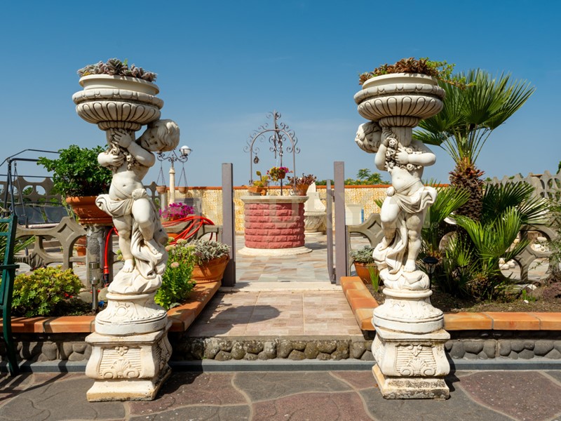 Al piano terra troviamo un ampio spazio cucina-salone, due camere da letto, bagno e un'ampia veranda che si affaccia su un grande terrazzo a livello con fontane, fioriere e gazebo.