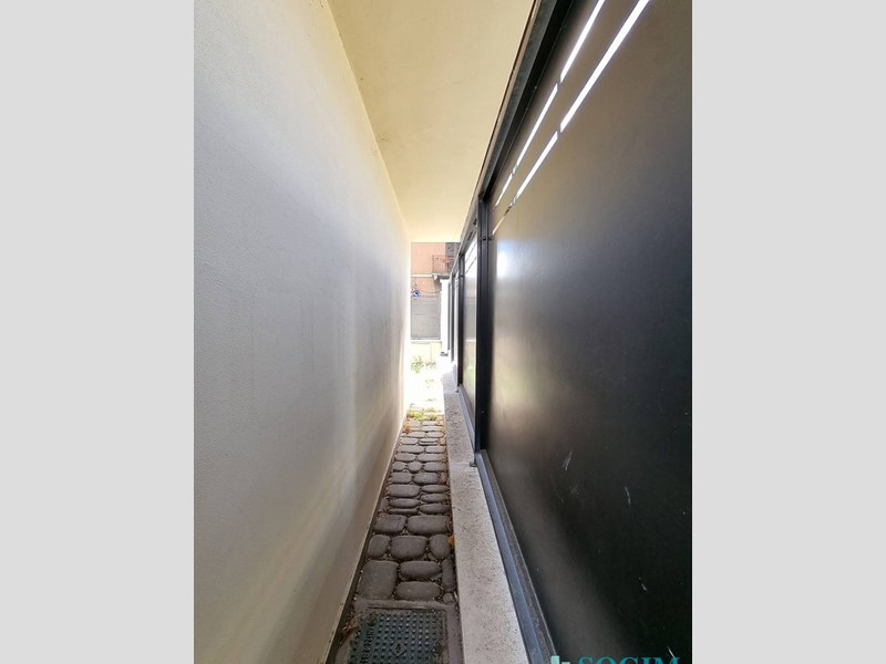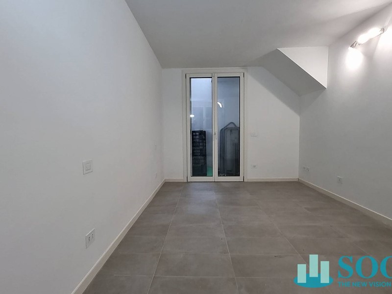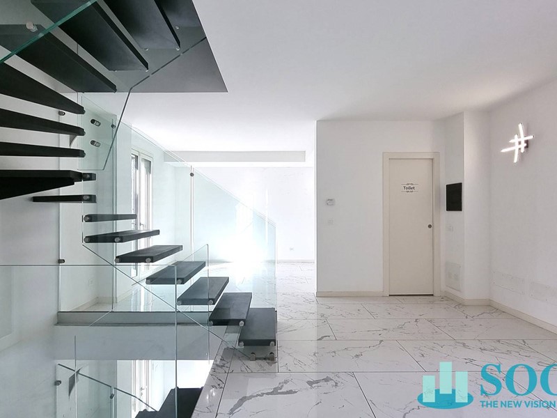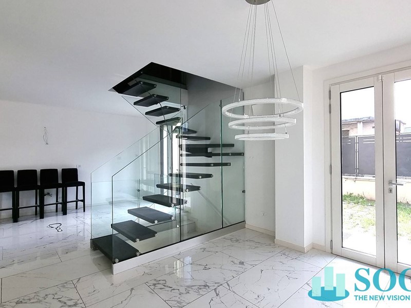 Dal giardino si accede al piano terra dove troviamo un unico ambiente open space da adibire a cucina a vista e soggiorno zona living, idealmente suddivisi dallelegante scala di design con struttura in vetro e gradini in legno. Un ampio disimpegno dà laccesso al bagno del piano. Ampie portefinestre, che rendono molto luminosi gli ambienti, permettono di fruire della parte esterna, sia al giardino sia al cortile, con accesso carraio per i posti auto.