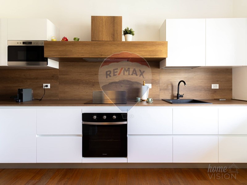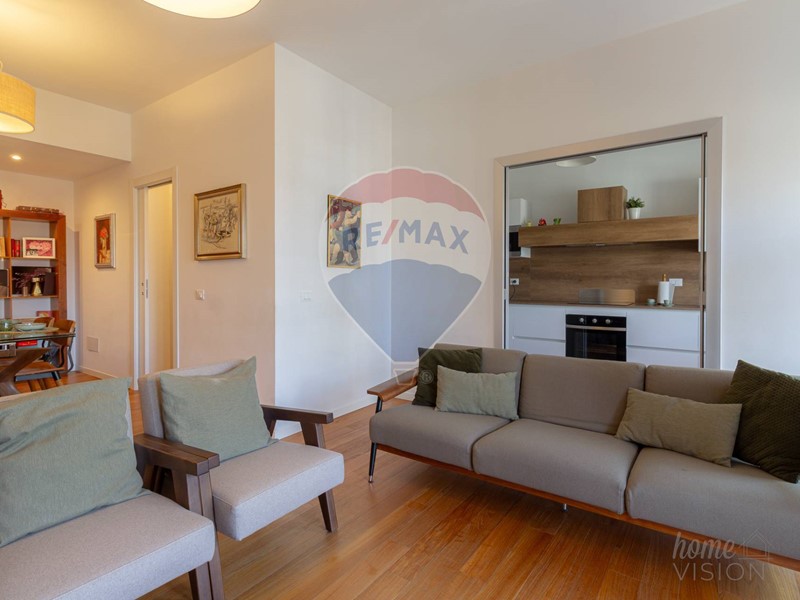 La zona giorno è composta da un soggiorno con cucina a vista, facilmente separabile grazie a un'elegante porta scorrevole in cristallo.