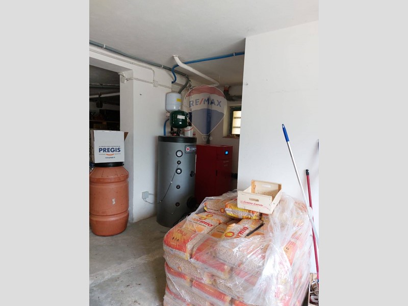 Riscaldamento a pellet con stufa, cisterna e coclea.