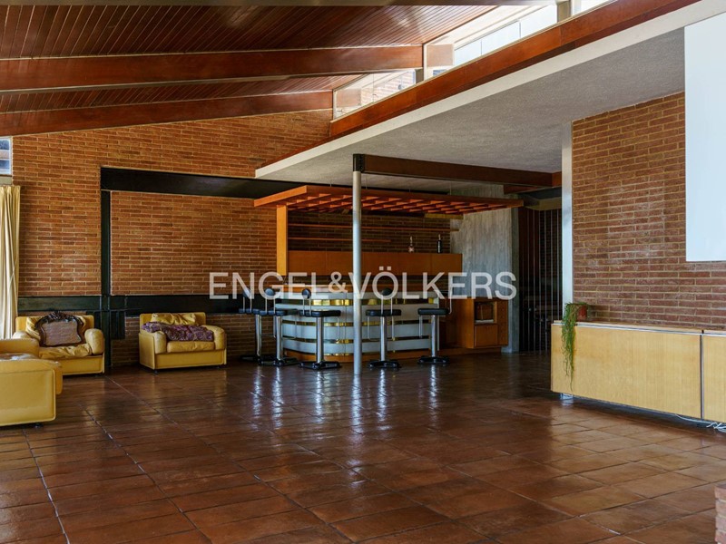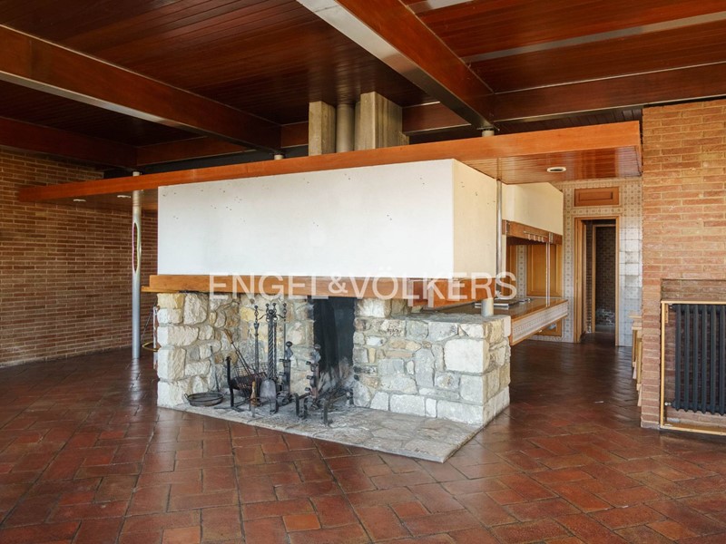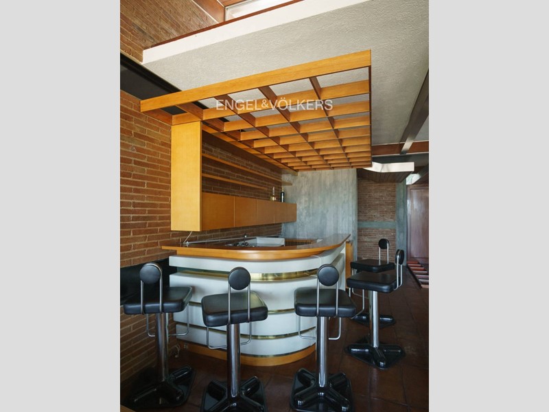 Un ampio ingresso conduce al salone principale, un ambiente luminoso e scenografico con camino a vista e angolo bar, circondato da grandi vetrate che aprono sul terrazzo perimetrale con vista mozzafiato.