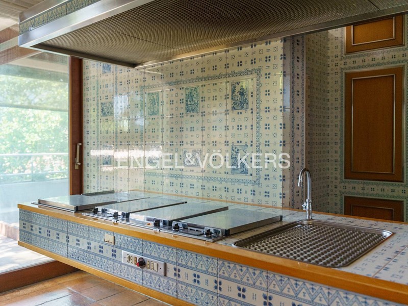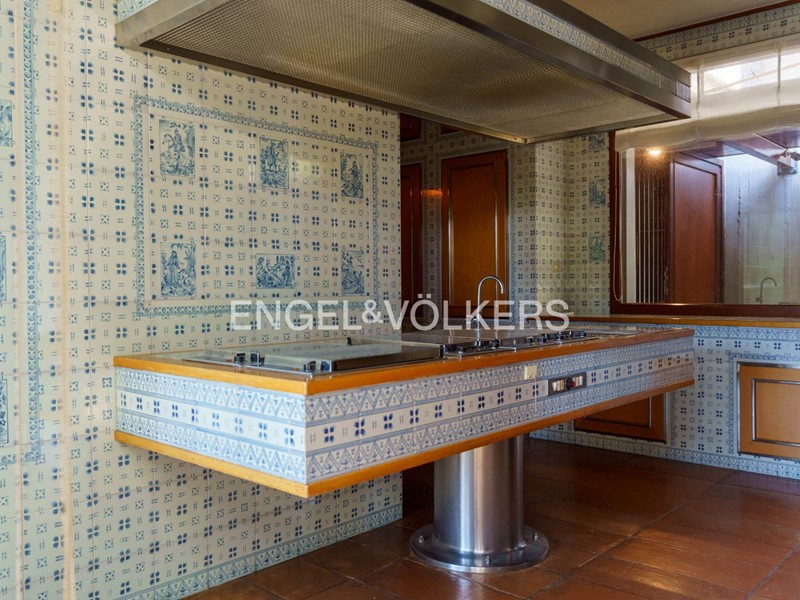La cucina a isola, arricchita da pavimentazioni in cotto e ceramiche uniche, si collega a un pratico ambiente di servizio, creando uno spazio funzionale e conviviale.
