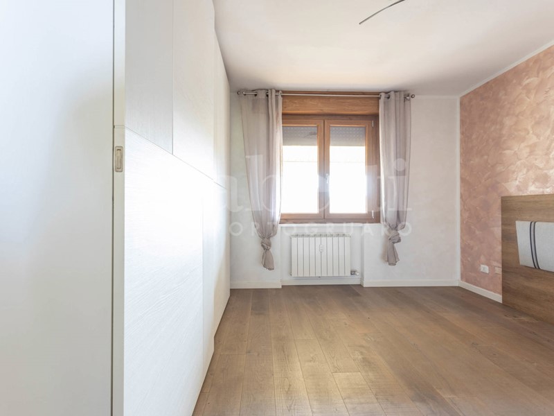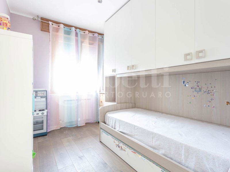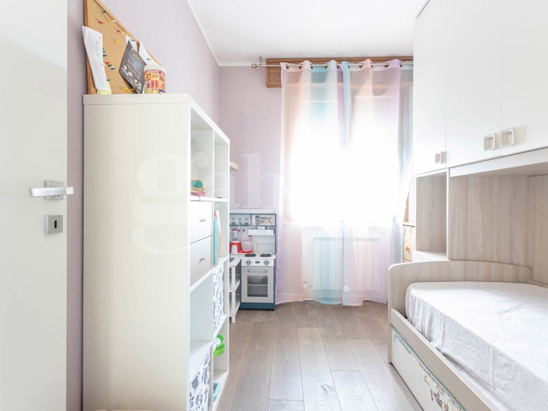 La zona notte, climatizzata, offre una camera matrimoniale ampia, una cameretta singola e un bagno finestrato completamente ristrutturato, con box doccia.