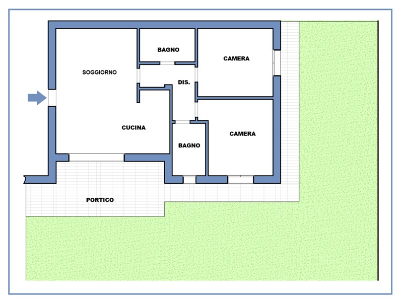 L'ingresso conduce ad un ampio e luminoso soggiorno con una zona cucina e con un grande portico di 18 mq. perfetto per cene all'aperto.