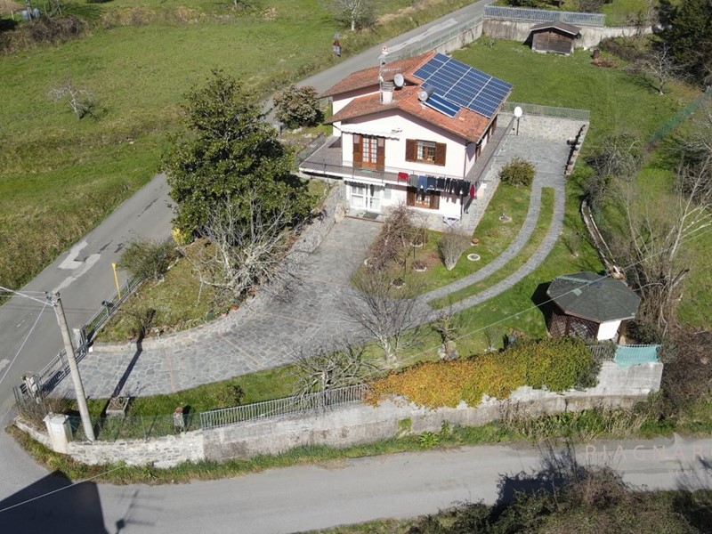 Proponiamo questa affascinante villetta bifamiliare in vendita, immersa nella tranquillità e circondata dal verde nelle colline del comune di Tresana. Con una superficie commerciale di 273 m², l'immobile si sviluppa su due piani, offrendo la possibilità di creare due unità abitative distinte. Ideale per famiglie o come investimento, questa casa è distribuita con due camere, cucina, ampio bagno e sala al piano primo, l'appartamento è disposto in un unico livello garantendo facili spostamenti. Il piano terra è accessibile tramite scala interna oppure da entrata indipendente dal giardino, è composto da angolo cottura con open space nell'ampia e luminosa sala, ripostiglio, due camere da letto e bagno. Vanta 11 locali ben distribuiti, in più un garage e una comoda cantina. \nIl giardino è pianeggiante e ben distribuito, si può accedere con la macchina alla proprietà grazie ad un cancello elettrico.\n\nGrazie ai pannelli solari e al pozzo con sorgente per alti livelli d'acqua, potrai godere di un'ottima efficienza energetica e di un comfort senza pari. La terrazza e il balcone sono perfetti per rilassarsi all'aperto, mentre il box offre spazio aggiuntivo per il tuo veicolo. Situata su un appezzamento di circa 1.000 m², questa proprietà è in buono stato e pronta per essere abitata. Non perdere l'opportunità di vivere in un luogo dove la natura incontra il comfort! - Maggiori Dettagli: Camino, Terreno