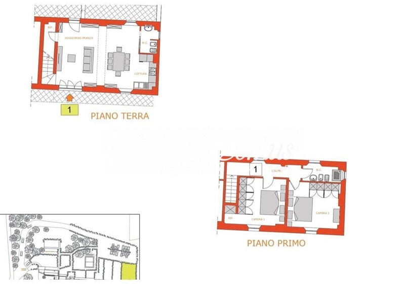 La porzione in oggetto e' segnata come la numero 1 nella piantina allegata e vanta una metratura di 123,50 suddivisa su due livelli posta a piano terra, composta da soggiorno con accesso a giradino privato di 370 mq, cucina, bagno e ripostiglio, piano superiore due ampie e confortevoli camere e secondo bagno.