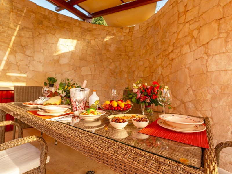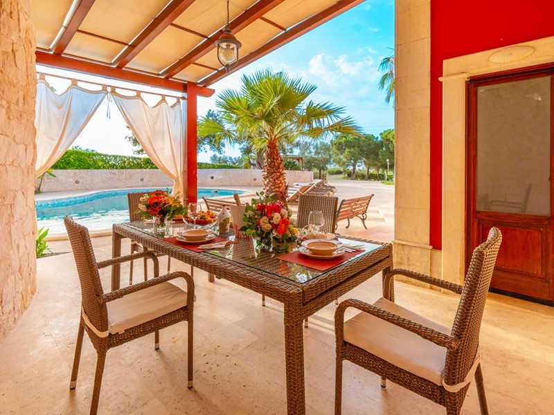 L'area esterna comprende una piscina meticolosamente mantenuta per il vostro svago e divertimento, una deliziosa zona pranzo vicino alla piscina, circondata da rigogliose palme e ulivi.