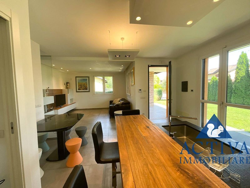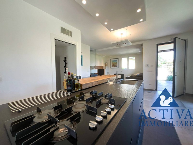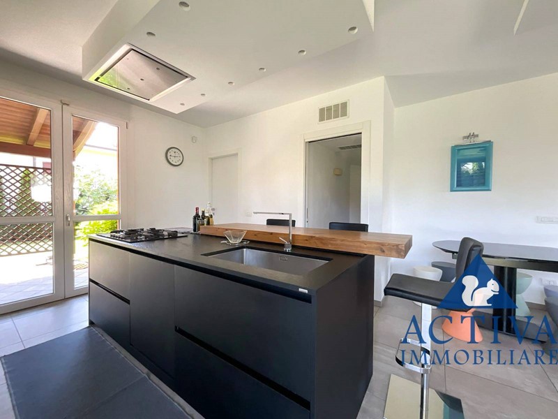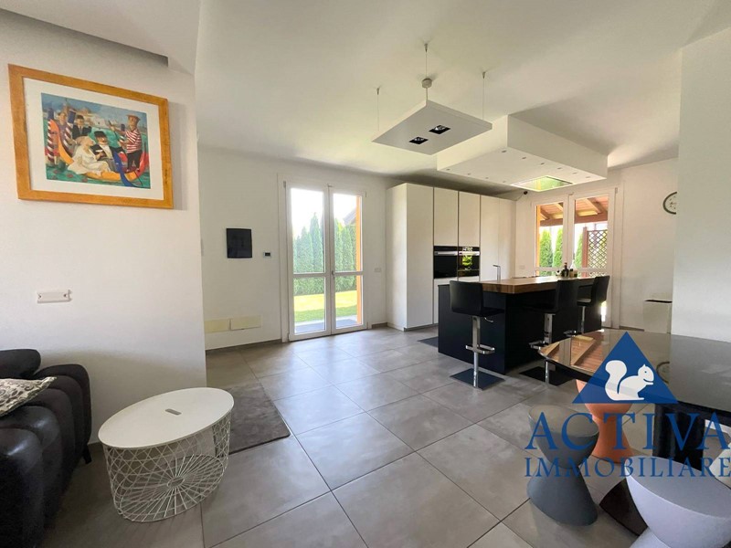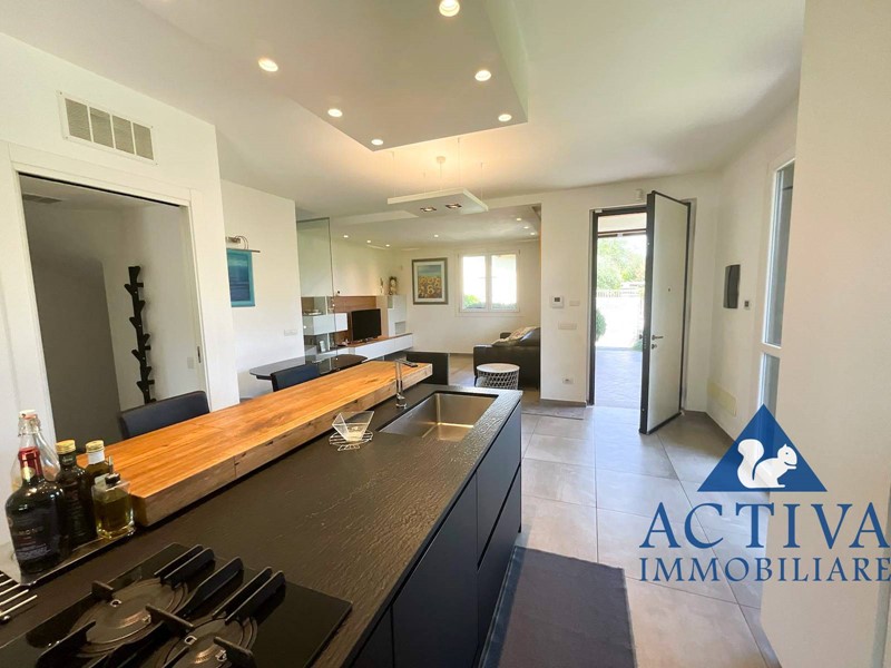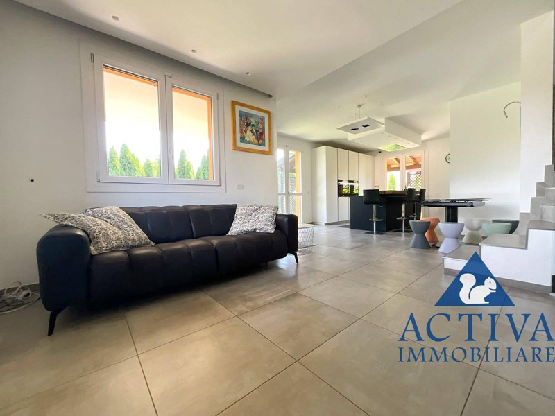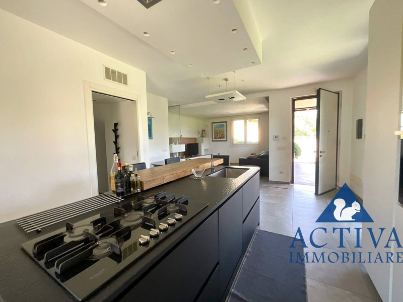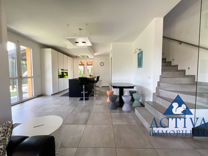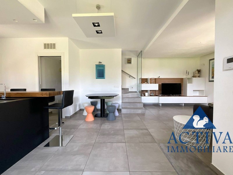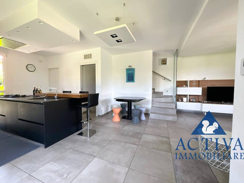 La cornice di questa villa è un meraviglioso portico che partendo dallingresso si prolunga ampliandosi sulla zona retrostante per godere al meglio del verde esterno le cene conviviali. Al suo interno invece locchio si perde in una moderna e luminosa zona living organizzata con intelligenza e tocco di design per offrire praticità ogni giorno; la cucina a vista pensata con isola centrale acquistabile a parte insieme agli arredi su misura dellinterrato, dialoga con il portico coperto di circa 30 mq e con il grande giardino piantumato, trasformando lesterno in una naturale estensione della casa. Il bagno di servizio completa il piano.