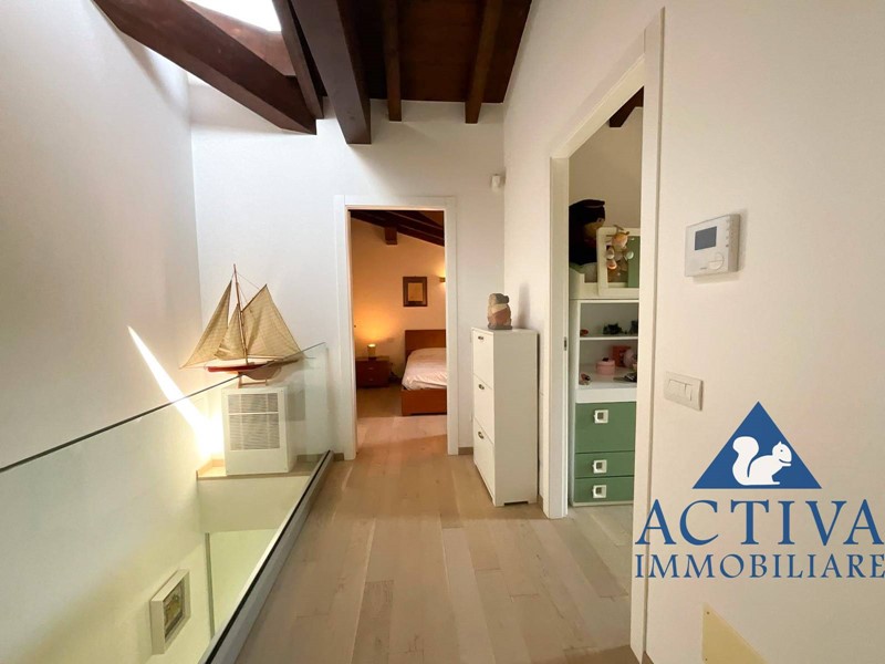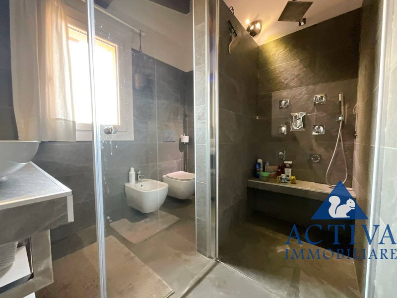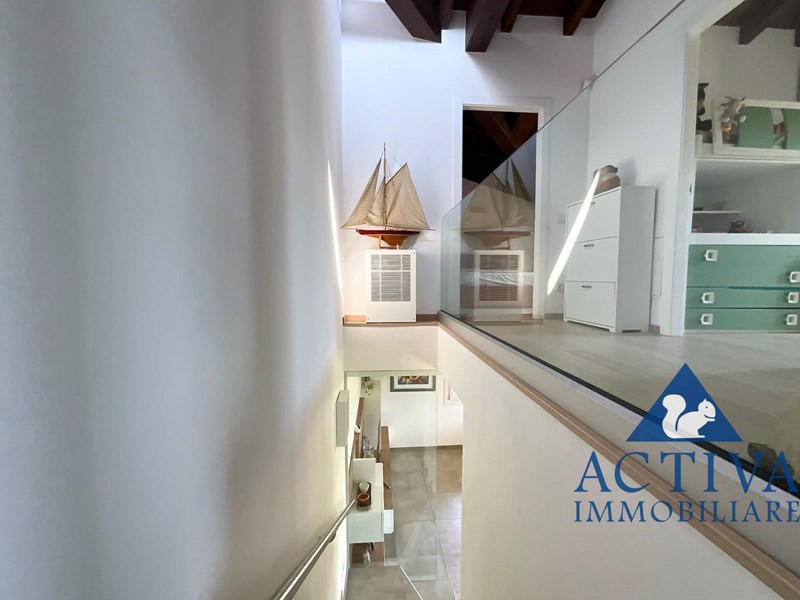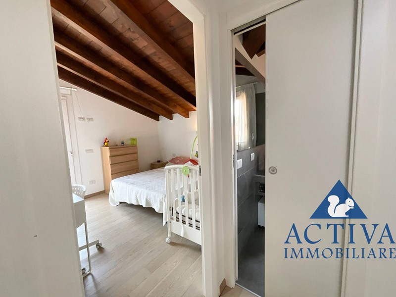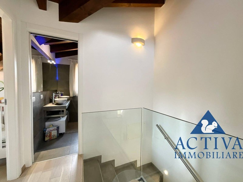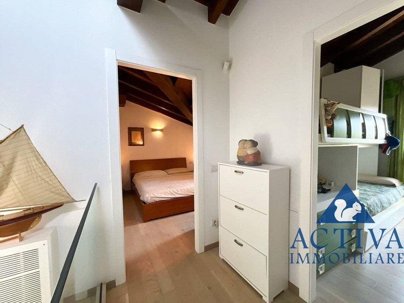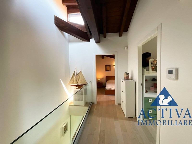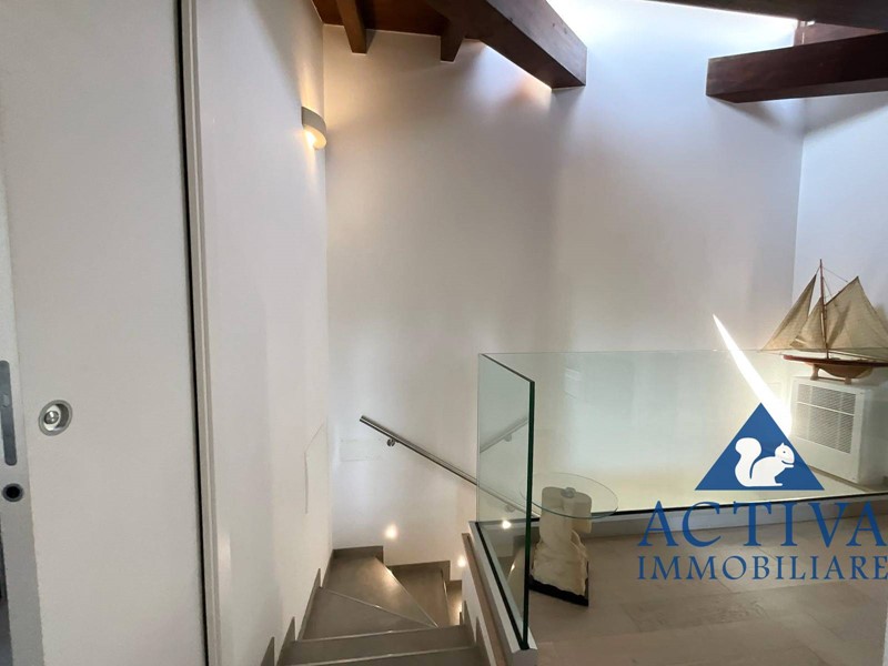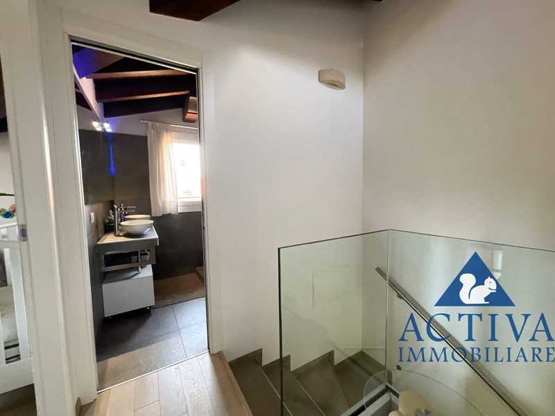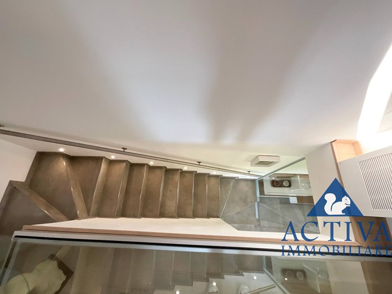 La scala con parapetti in vetro e faretti segna-passo di alto design conduce alla zona notte con tre camere ampie articolareggiate dalle travi a vista e con affacci su balcone e terrazzo, infine un bagno con doccia walk-in dal carattere esclusivo completa il piano.
