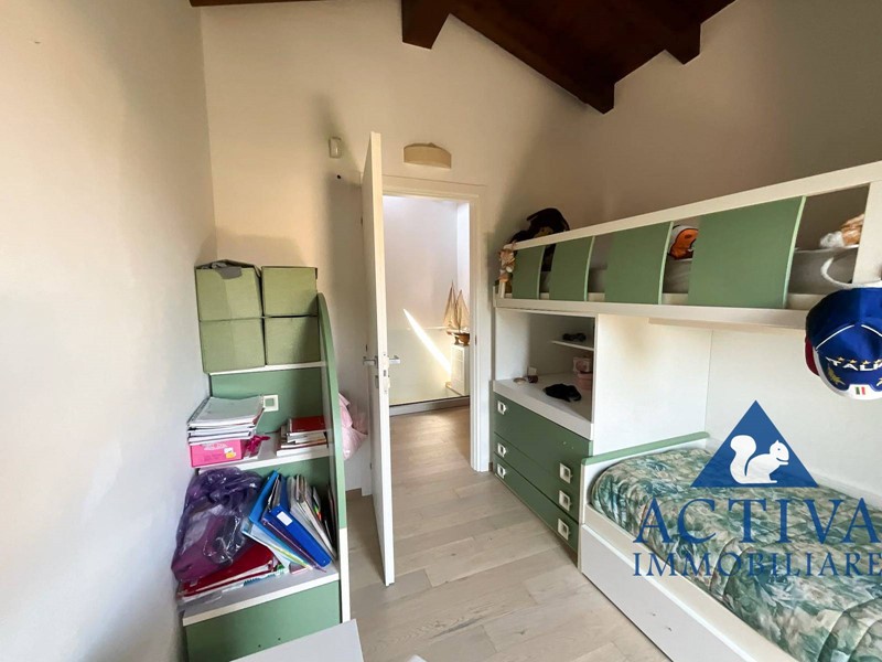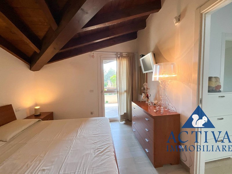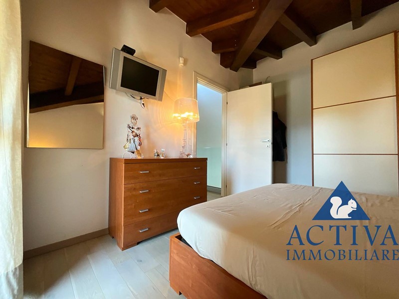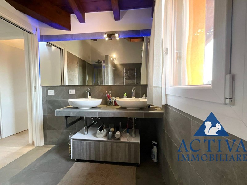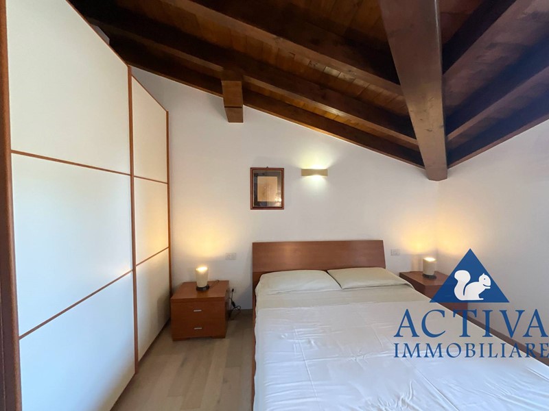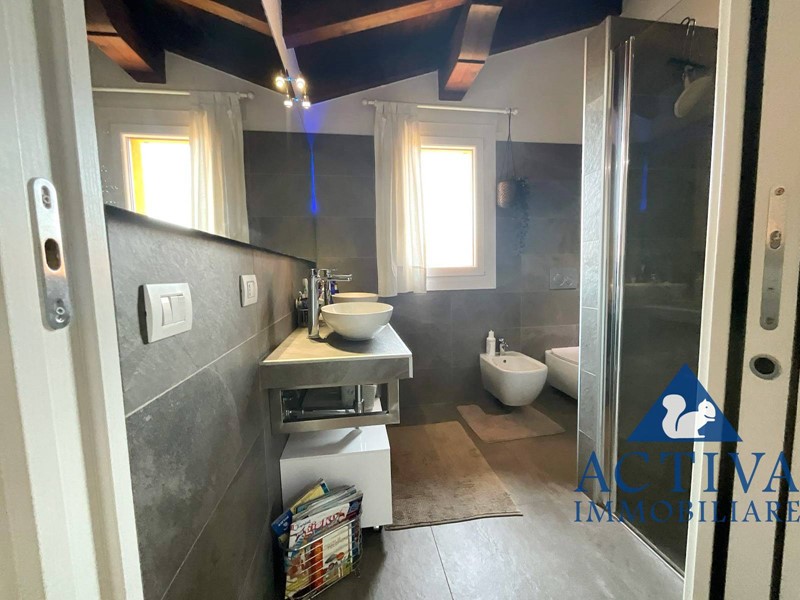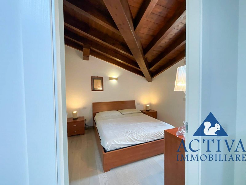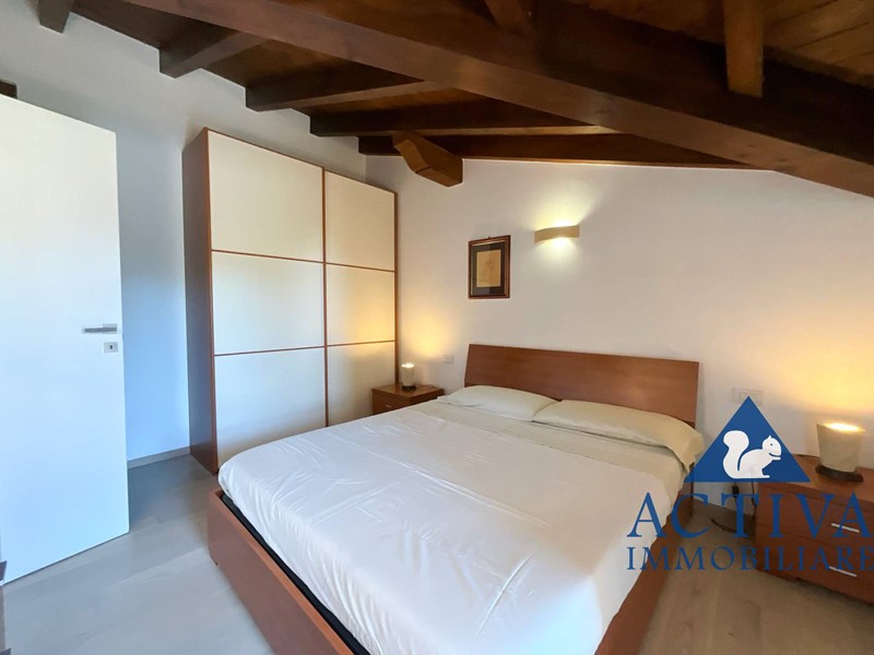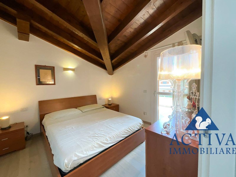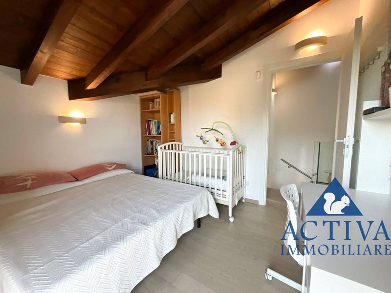 La scala con parapetti in vetro e faretti segna-passo di alto design conduce alla zona notte con tre camere ampie articolareggiate dalle travi a vista e con affacci su balcone e terrazzo, infine un bagno con doccia walk-in dal carattere esclusivo completa il piano.