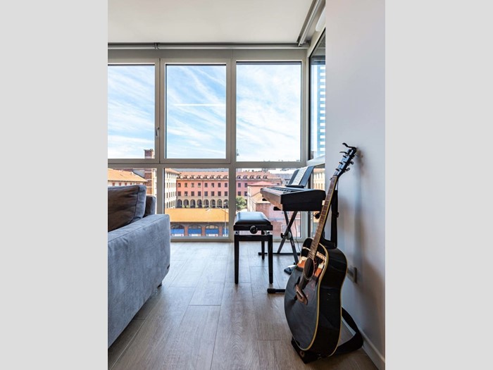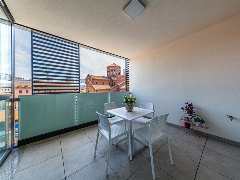 L'edificio si sviluppa su un'altezza di 9 piani e, più da vicino, l'abitazione è posta al piano quarto, ha una superficie commerciale di circa 85mq e si caratterizza per i panoramici affacci sulla Basilica di Sant'Agostino, le vetrate a tutta altezza e gli ampi e fruibili spazi esterni.