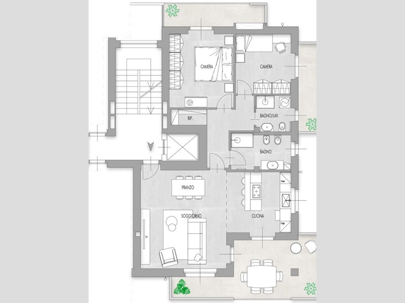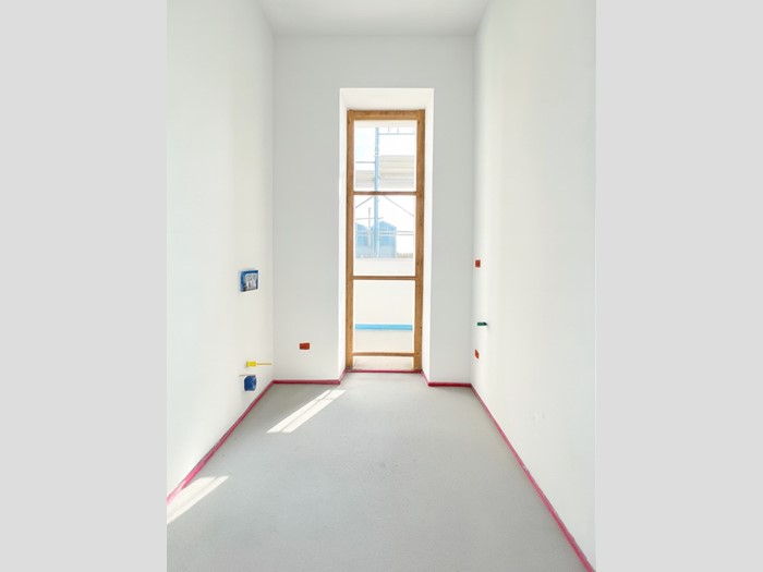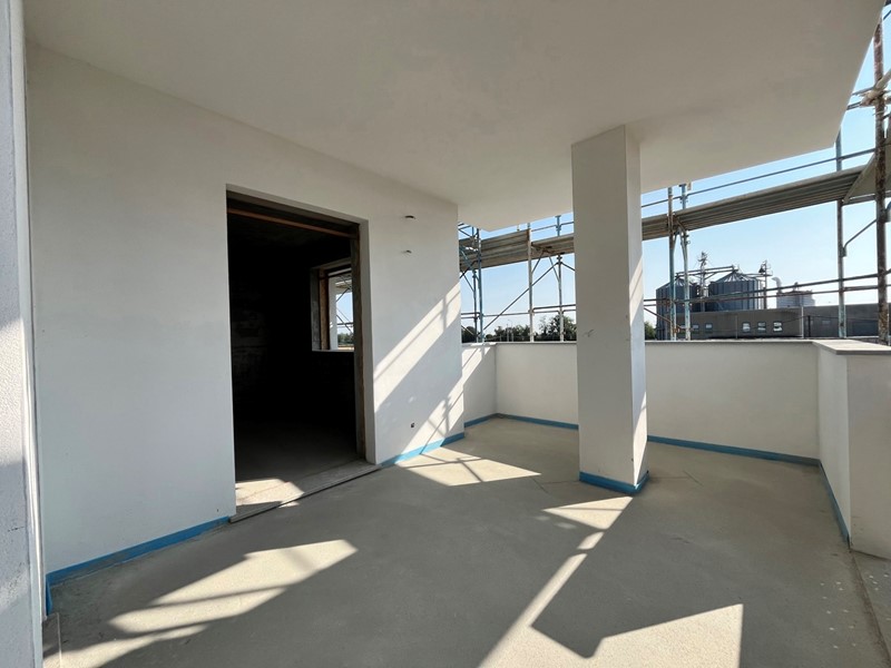 Situato al piano primo di un complesso residenziale signorile in costruzione, l'appartamento si compone con ingresso su zona giorno open - space, disimpegno, due camere da letto, due bagni, ripostiglio, due balconi ed il terrazzo ad uso esclusivo.
