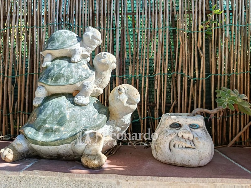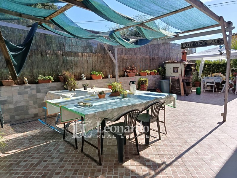 Il giardino è tutto piastrellato, ha un bel forno a legna e spazi conviviali.
