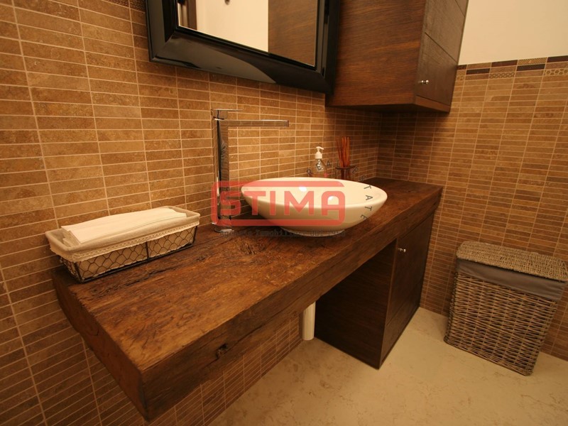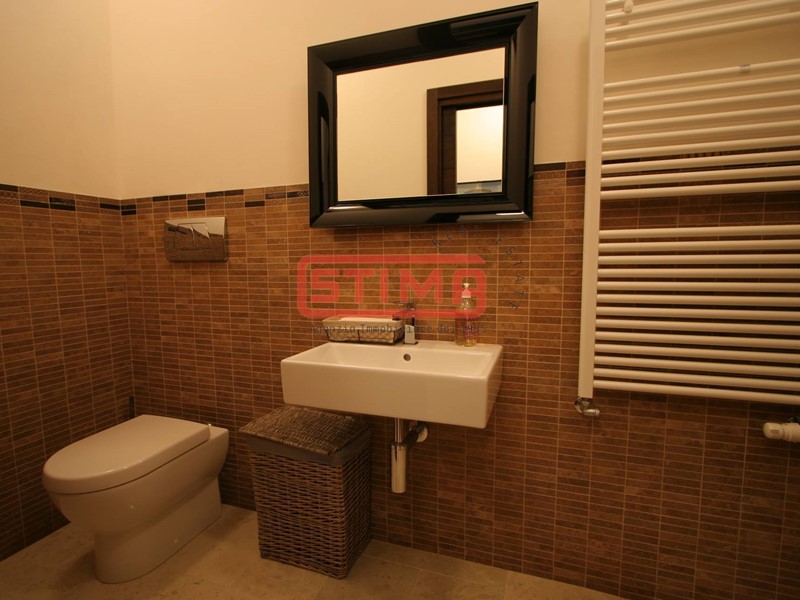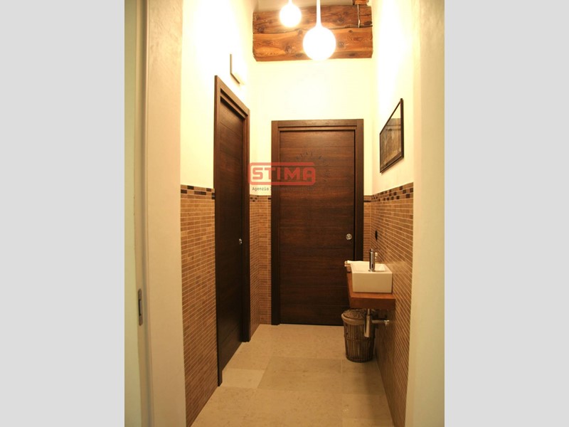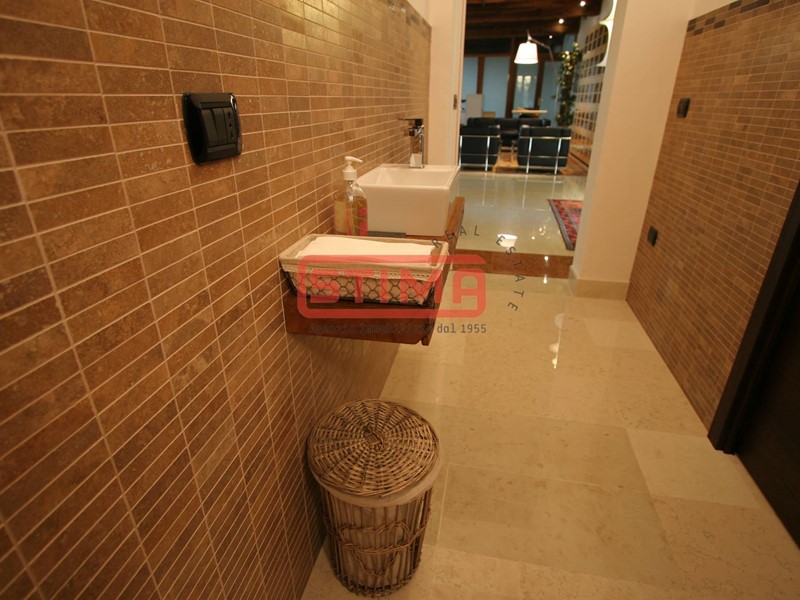Un ambiente unico, caratterizzato da ampie altezze (h 3,75 m) con travi originali a vista a tripla orditura, pavimenti in marmo bianco bordato in rosso Verona e dettagli raffinati che donano carattere e autorevolezza a ogni spazio.