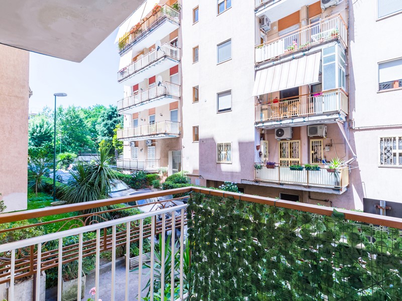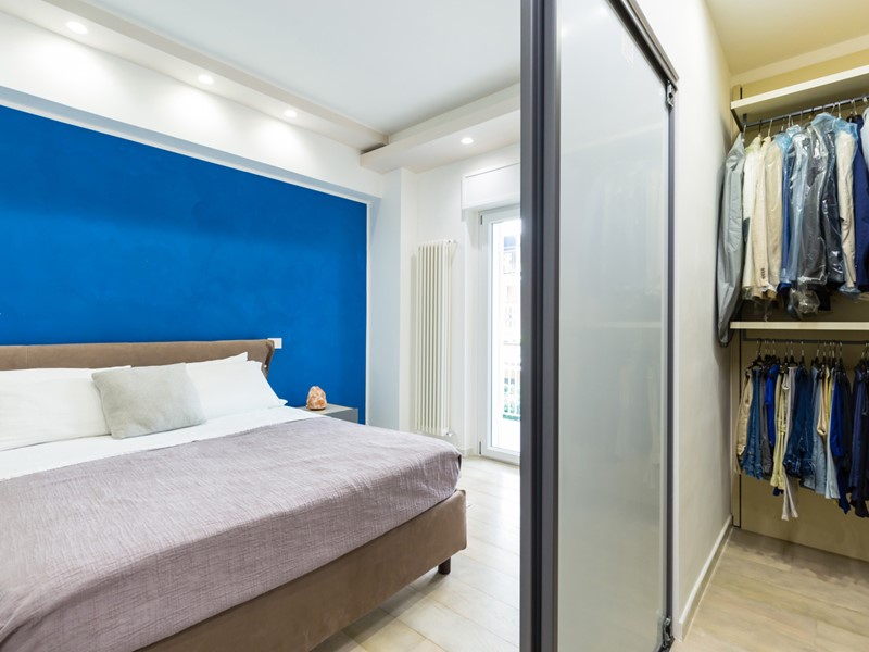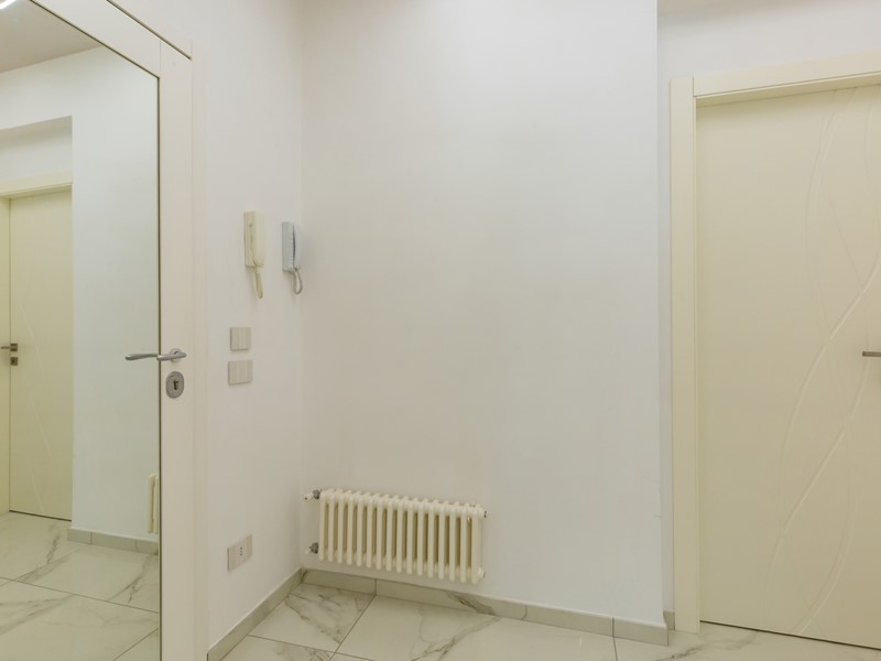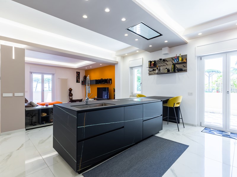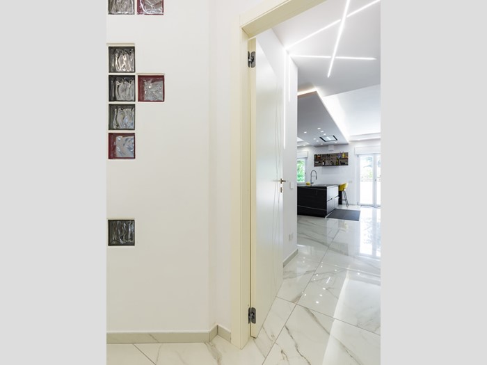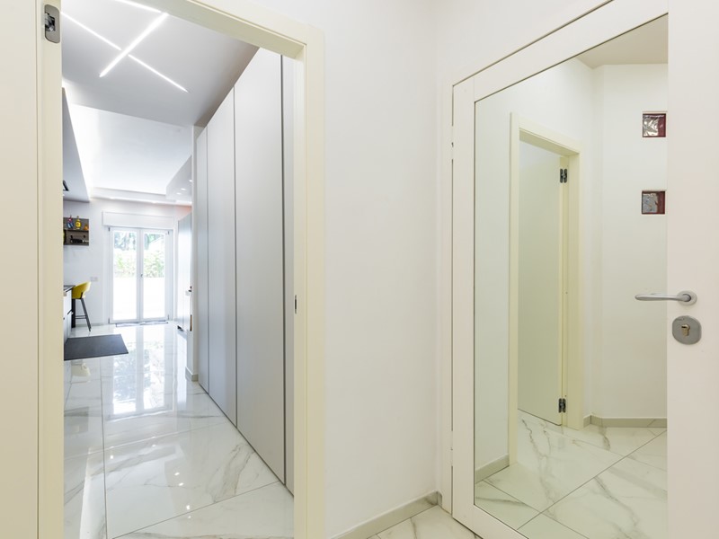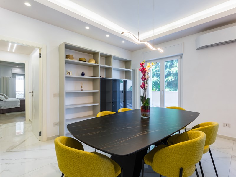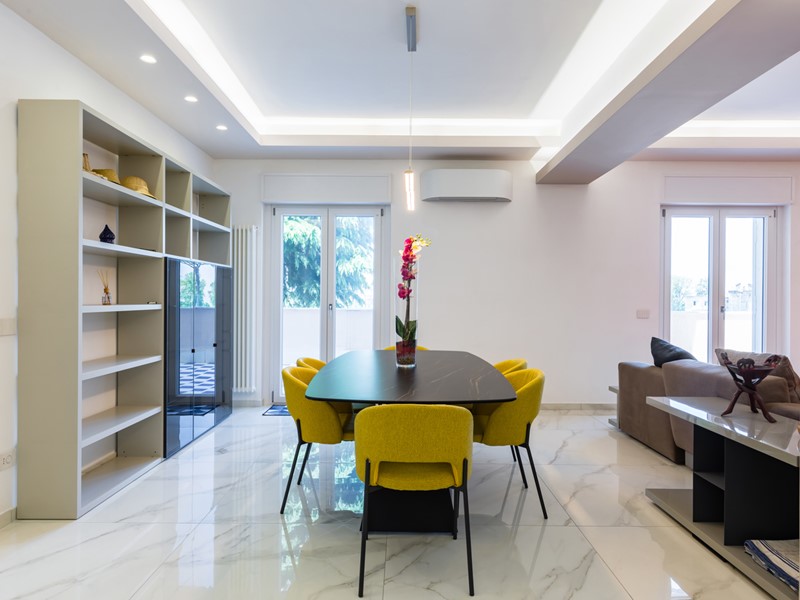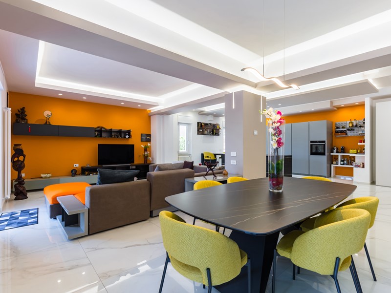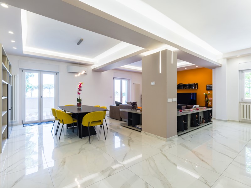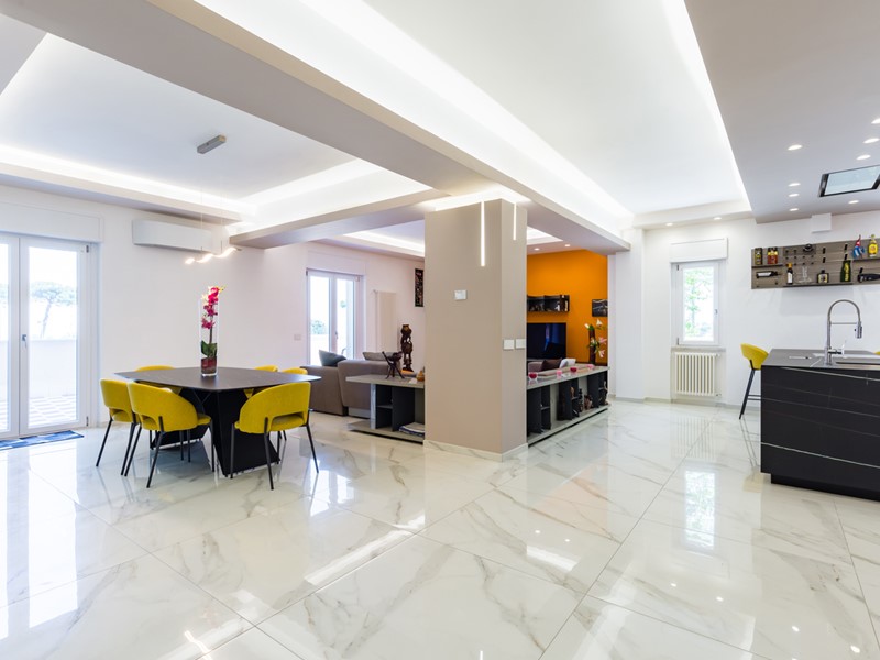 L'immobile si trova al primo piano servito da ascensore e copre una superficie di 145 mq interni, arricchita da oltre 100 mq di spazi esterni, tra terrazzo e balcone. La ristrutturazione è recente e di alta qualità: pavimenti in gres effetto marmo, controsoffitti con luci led, cucina a isola e una palette moderna che abbina toni freddi e accenti caldi.