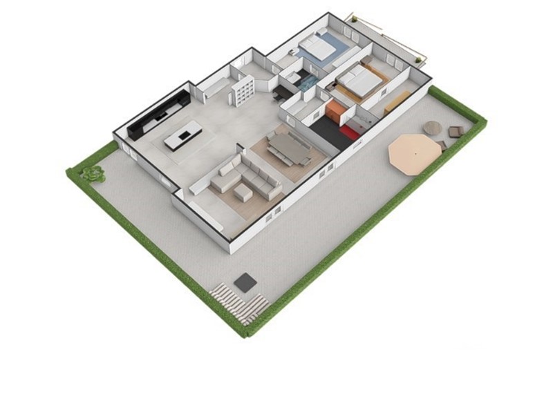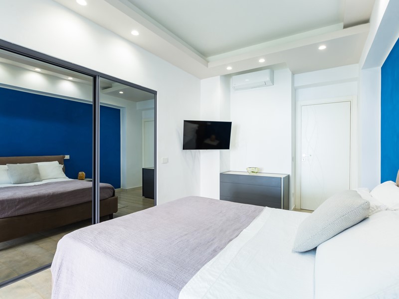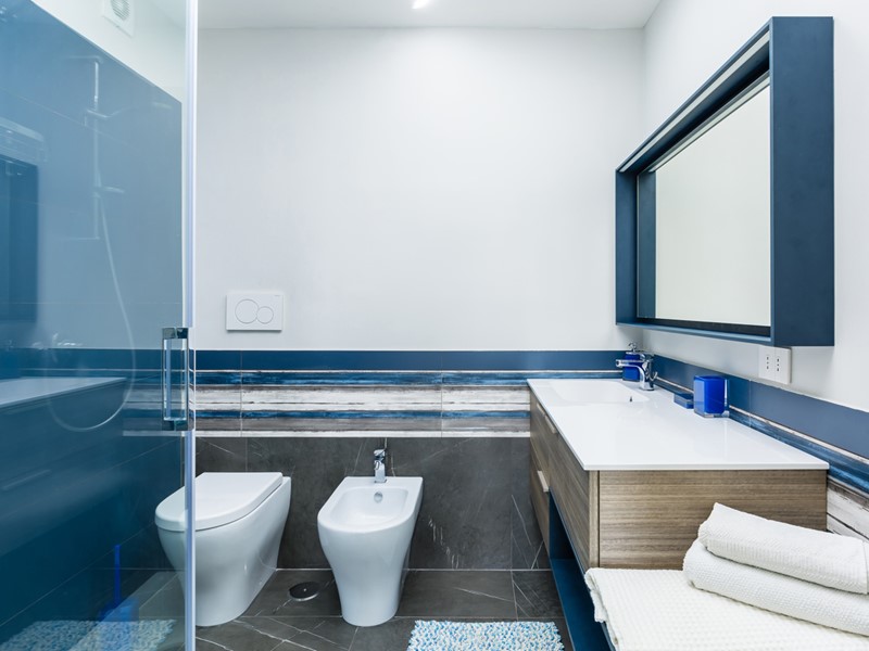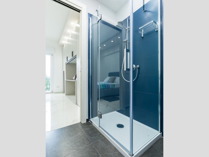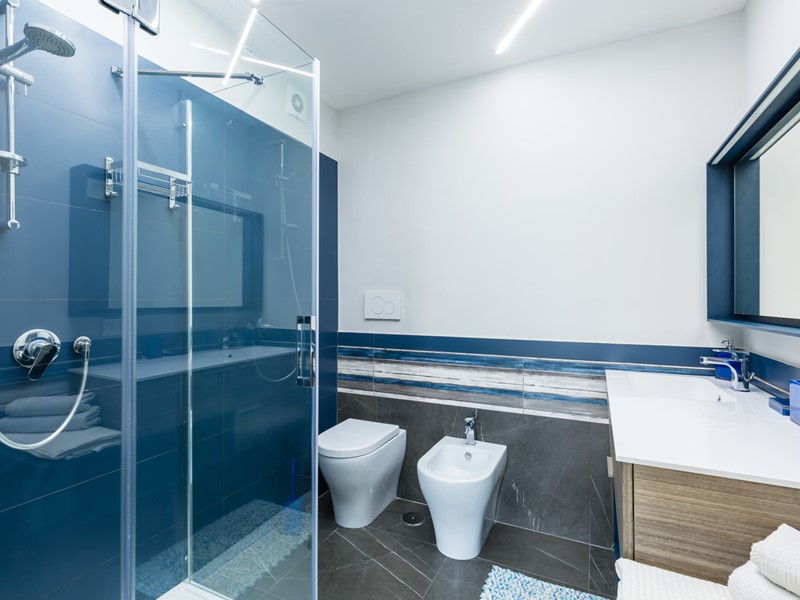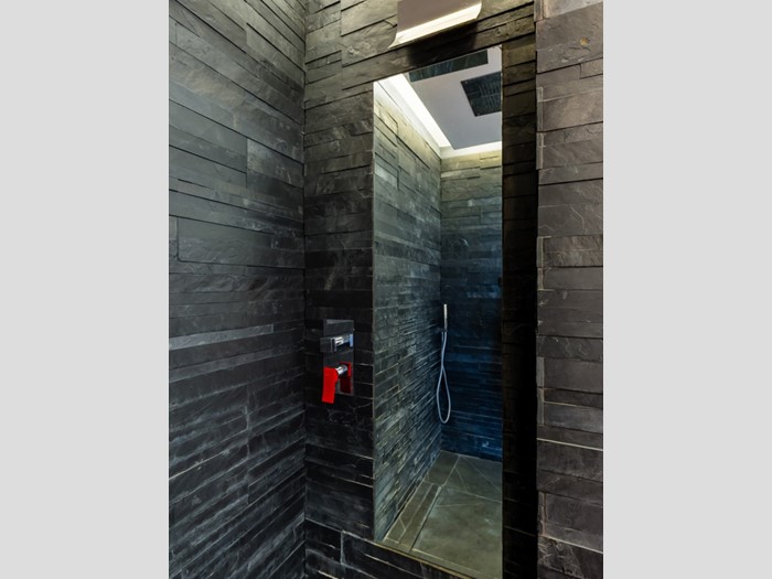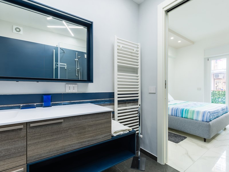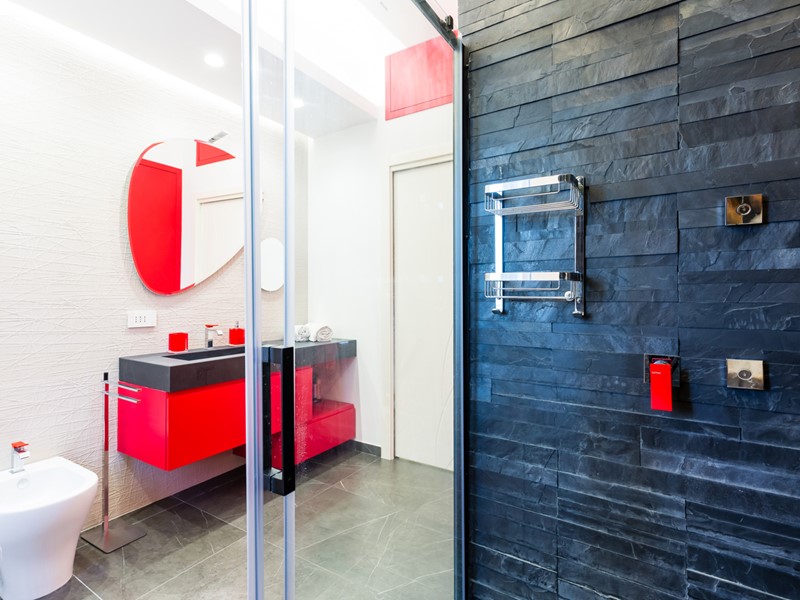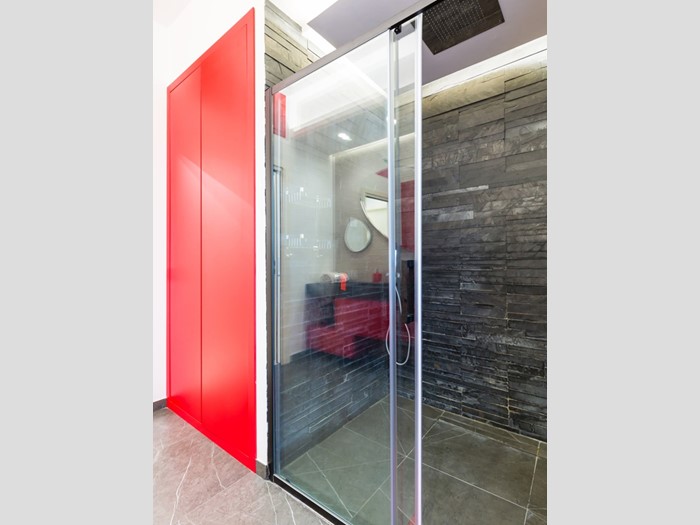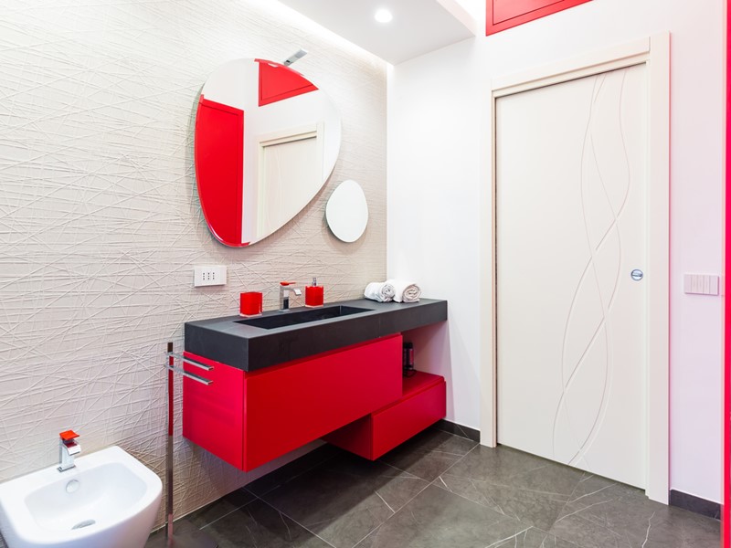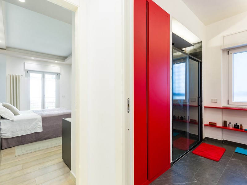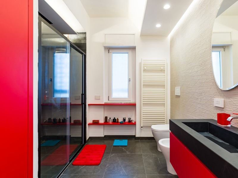 Le due camere da letto sono ben dimensionate e accoglienti; i due bagni presentano finiture eleganti, come il rivestimento in pietra e il mobile lavabo con dettagli in rosso, che conferiscono carattere e stile.