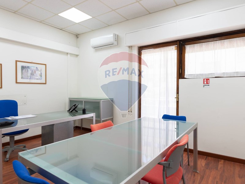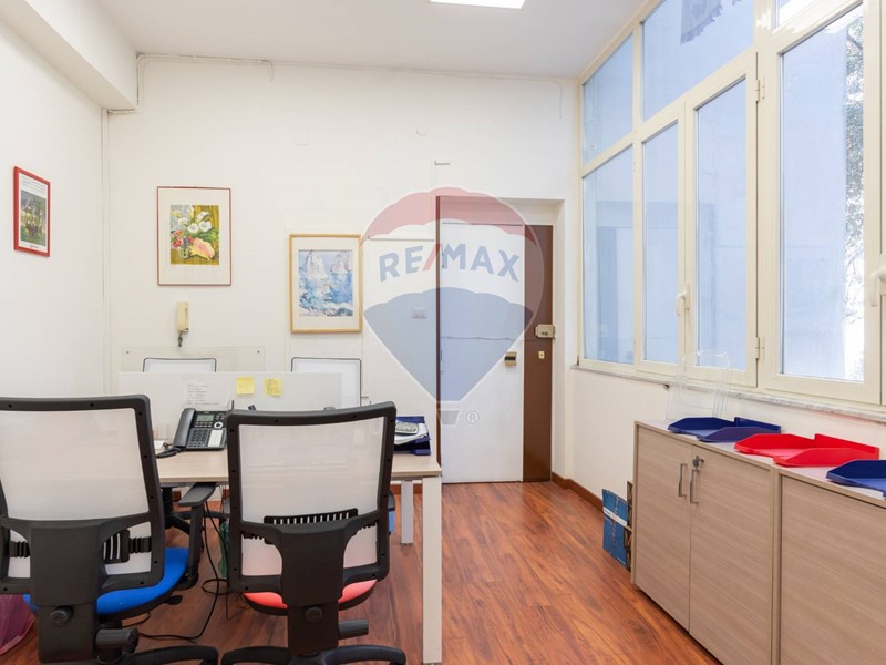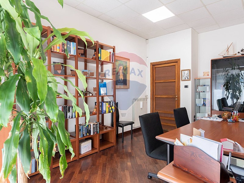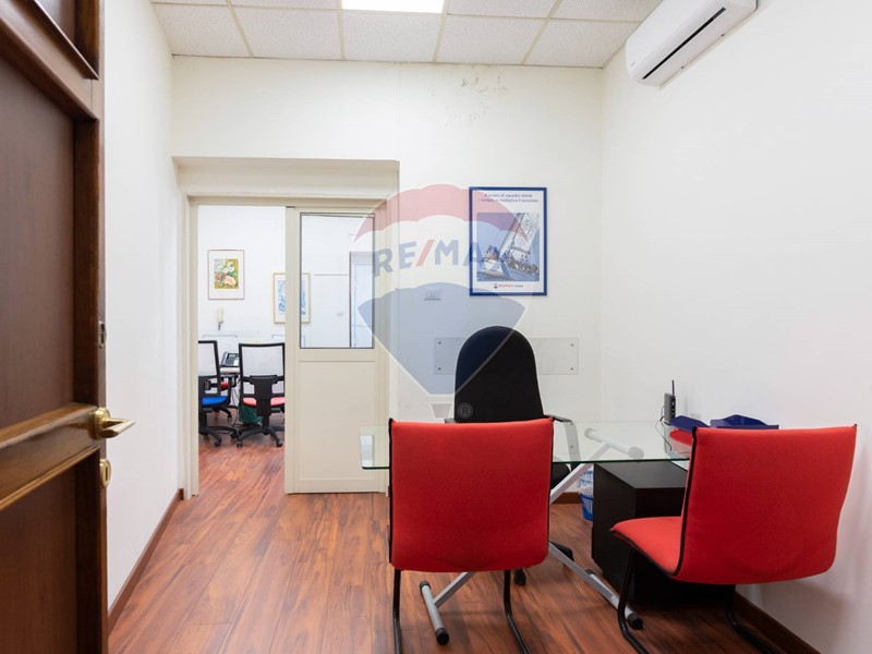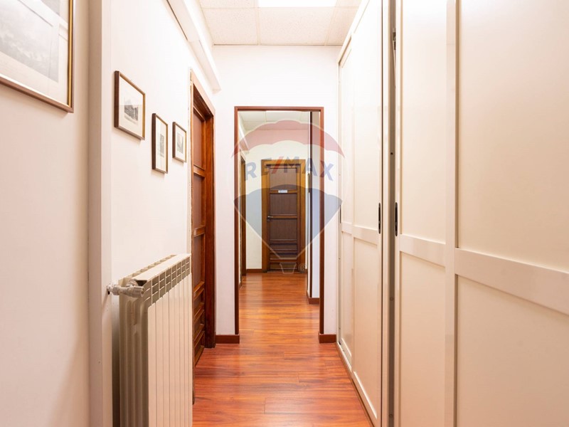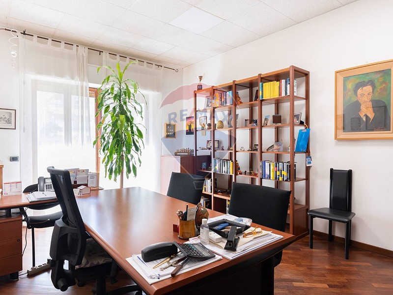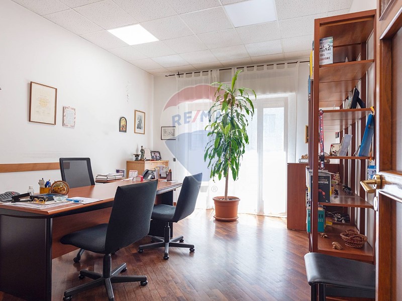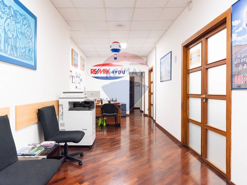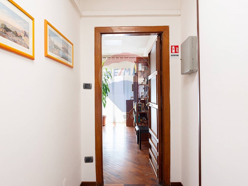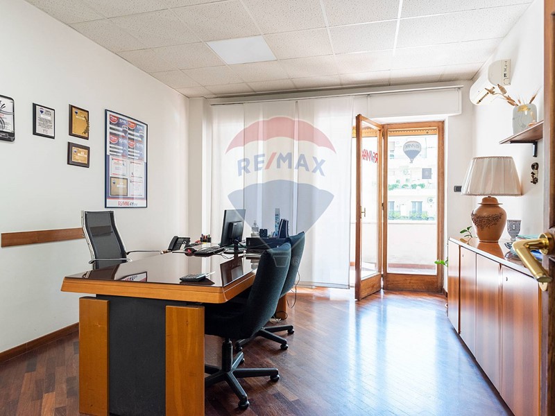 L'appartamento, nel recente passato locato ad uso ufficio, è attualmente composto da ingresso principale, grande corridoio con 4 ampie camere con sbocco diretto sulla balconata terrazzata esposta a Sud, un secondo corridoio con altre 2 camere con affaccio ad est ed a ovest, un grande salone con 3 aperture, 2 servizi, una cucina (da ripristinare, essendo stata eliminata), un ripostiglio ed un secondo ingresso in locale verandato.