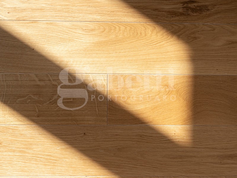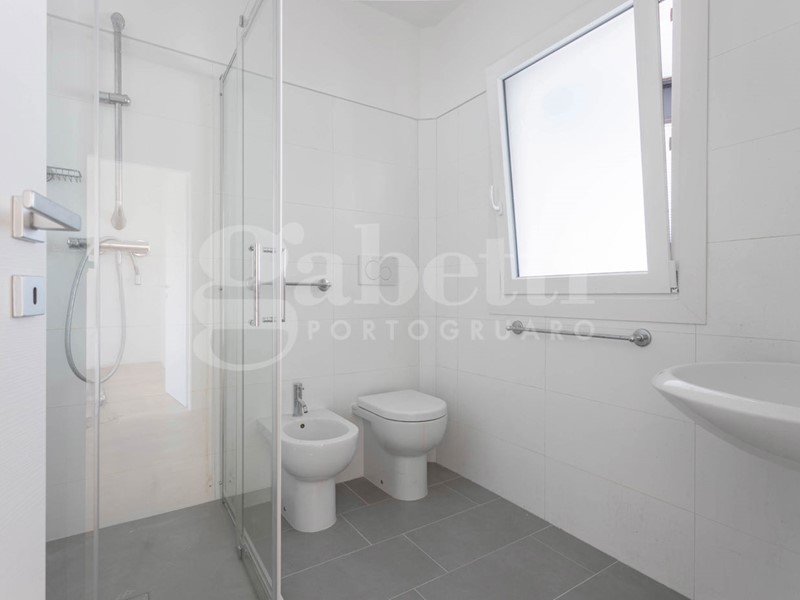 - Pavimenti interni in legno prefinito rovere, bagno in grès porcellanato e terrazzo con piastrelle beige