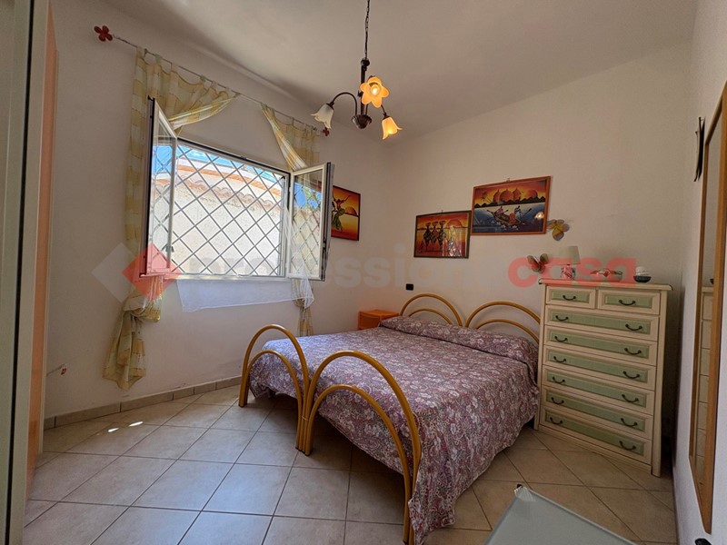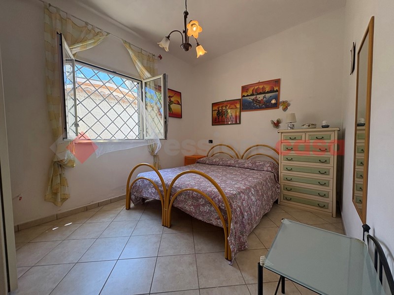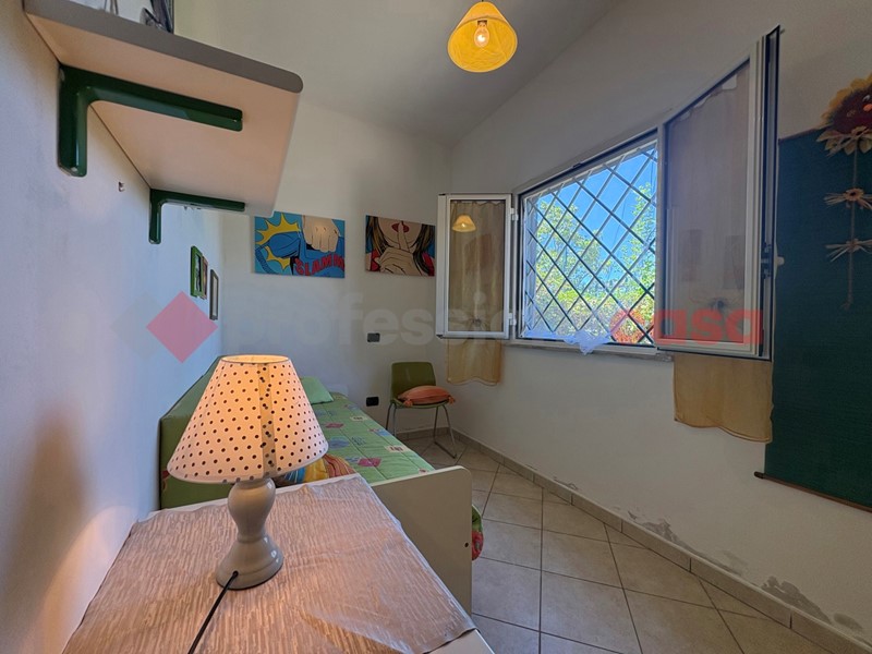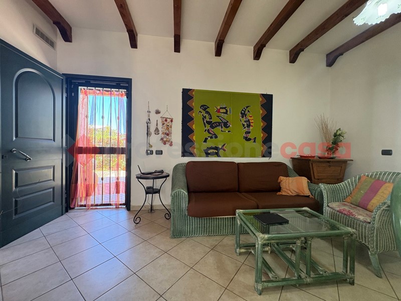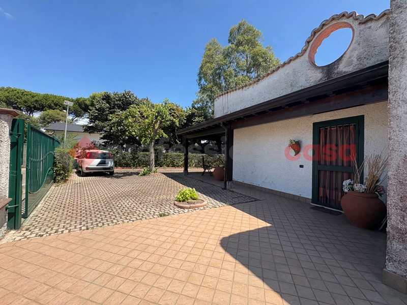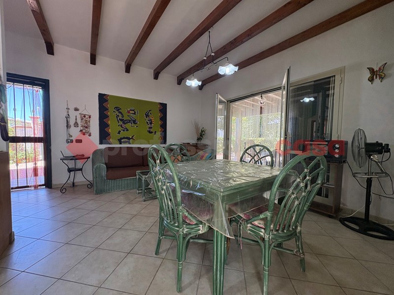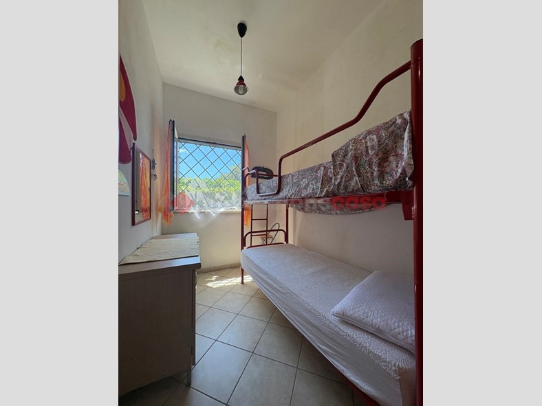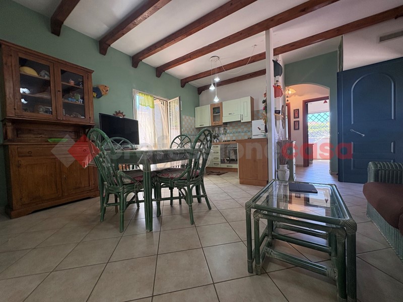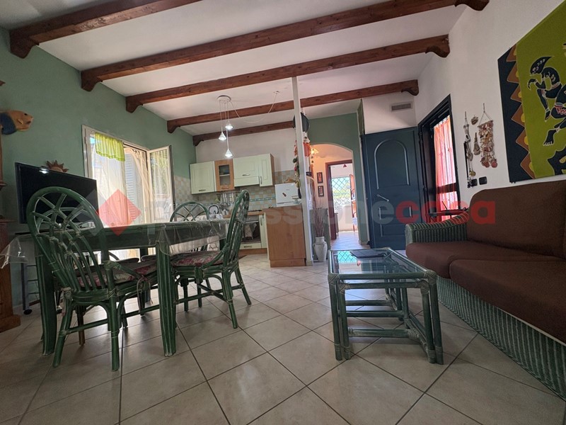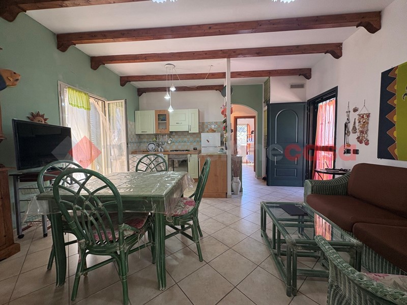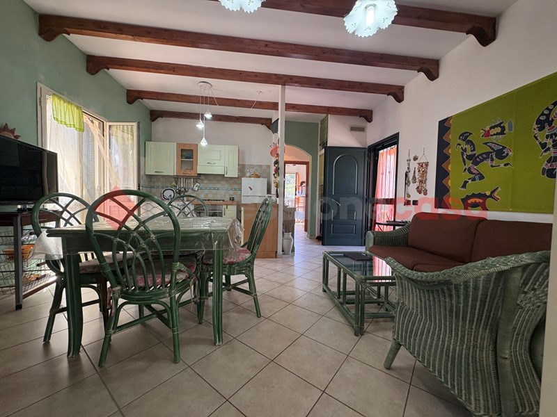 L'ingresso si apre su un luminoso ed ampio living con angolo cottura, avente due porte finestre che danno una sul giardino ed una sul portico. A seguire un disimpegno ci conduce ad un bagno con doccia, una camera matrimoniale ed altre due camerette. Nonostante l'assenza di condizionatori, risulta essere molto fresca e ventilata grazie agli alberi ad alto fusto che forniscono frescura ed anche grazie all'immediata vicinanza del mare.