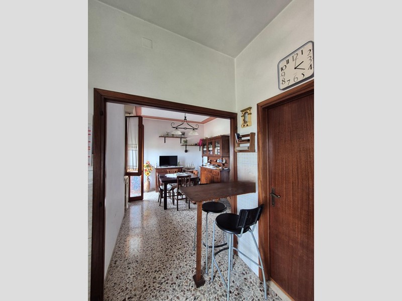 Entrando si trova un grande ingresso, tipico della sua epoca di costruzione, da cui si accede ad un salone e alla cucina/pranzo con ripostiglio/dispensa, entrambi dotati di accesso al terrazzo.