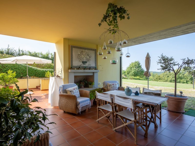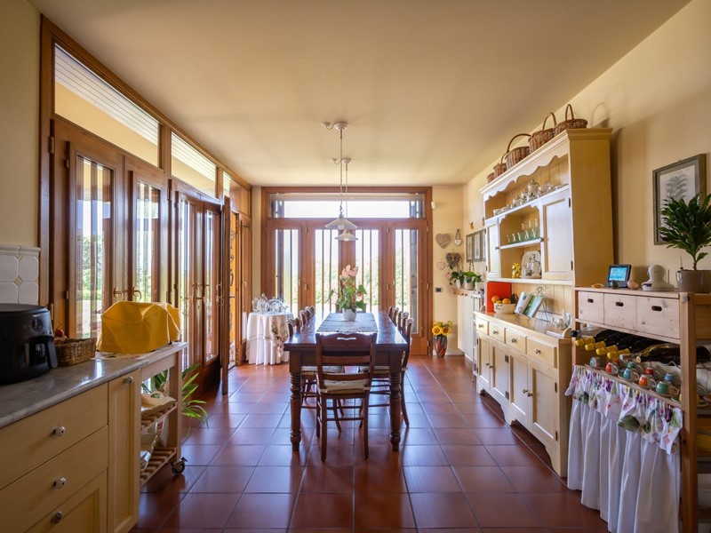 Al piano sottostante troviamo un'ulteriore ampia cucina, locale taverna/soggiorno, due camere, due bagni, cantina, lavanderia e un bel portico affacciato sul panorama.